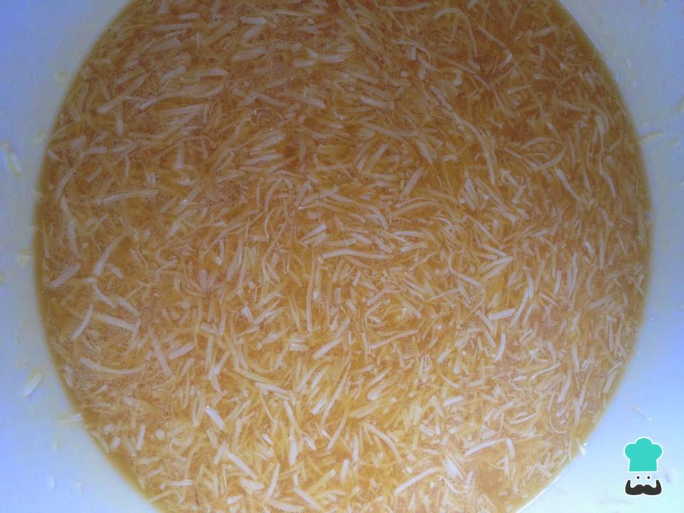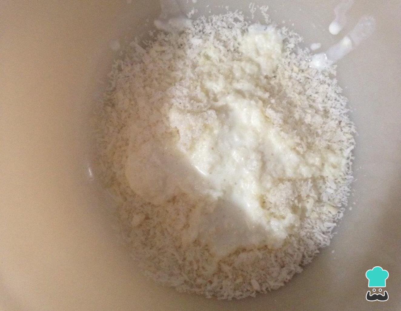 O primeiro passo para fazer esta receita de quindim de caneca é untar muito bem uma caneca ou tigela de cereais com manteiga. Misture o coco e o leite, transfira para a caneca e deixe ficar por 2 minutos, para que o coco hidrate.