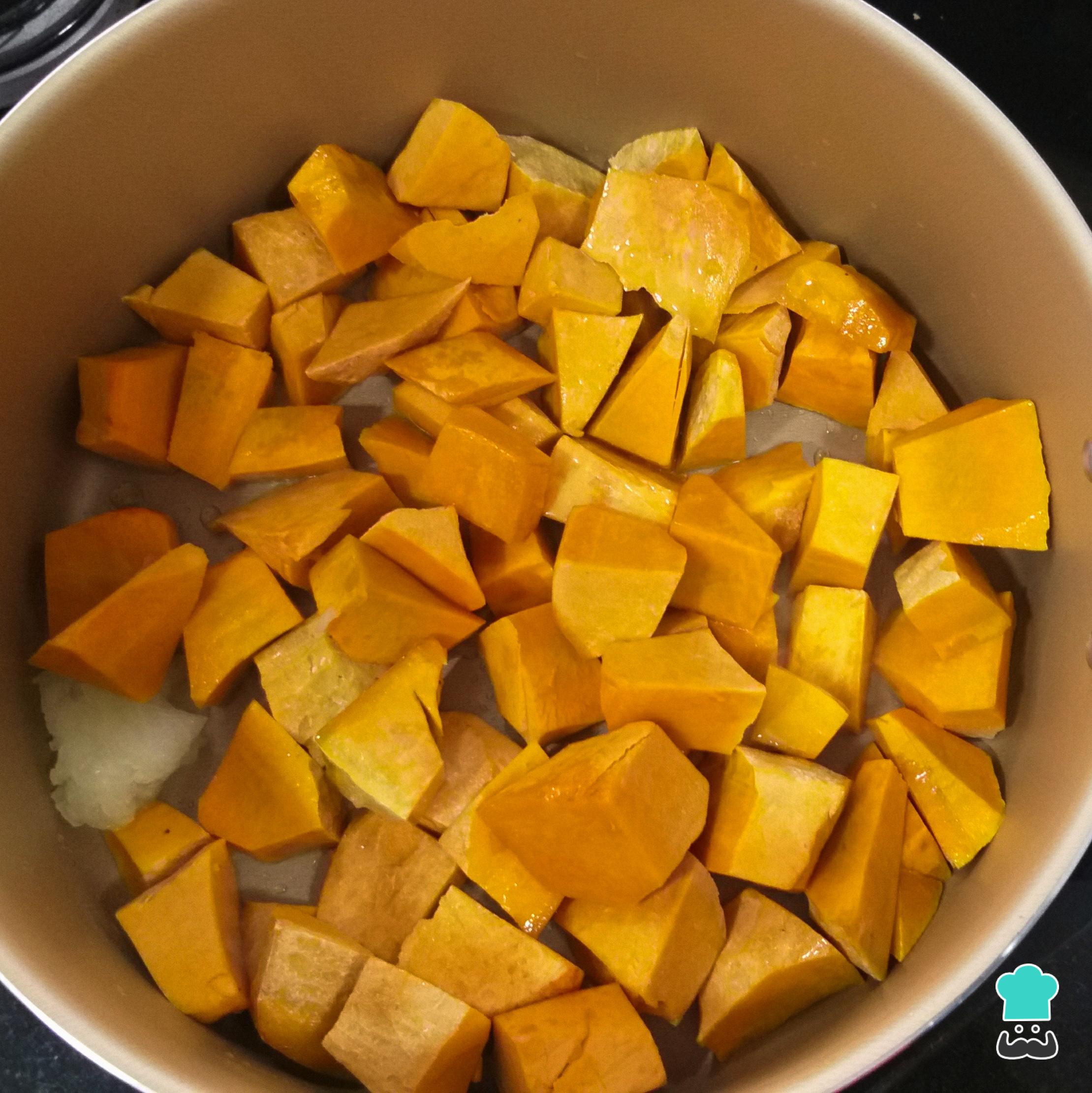 Leve uma panela ao fogo médio e acrescente o azeite, a cebola e a abóbora picadas. Mexa por 2 minutos, para refogar.