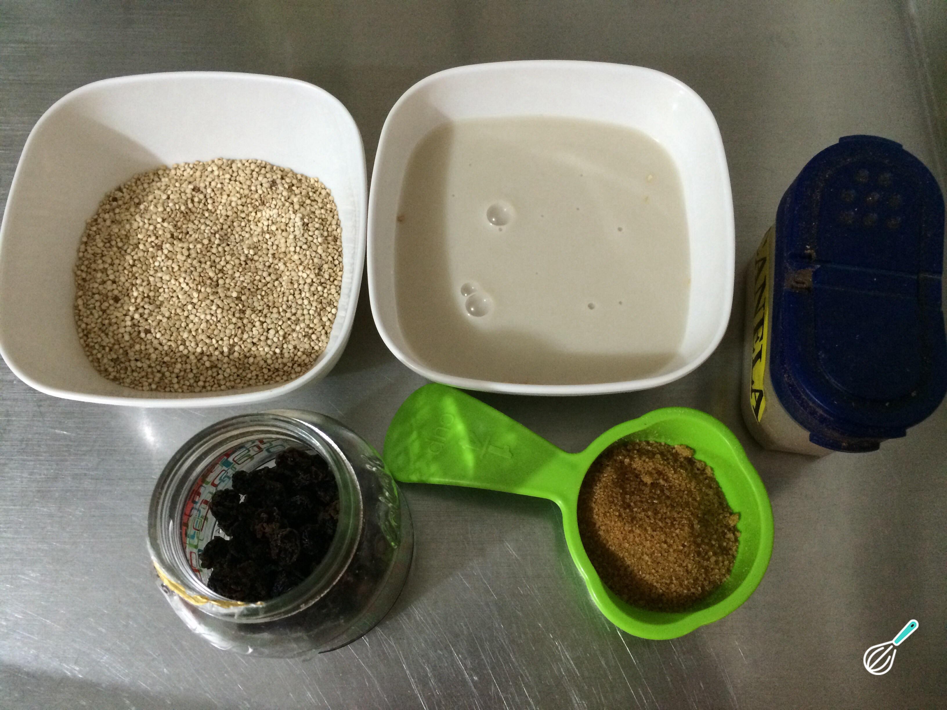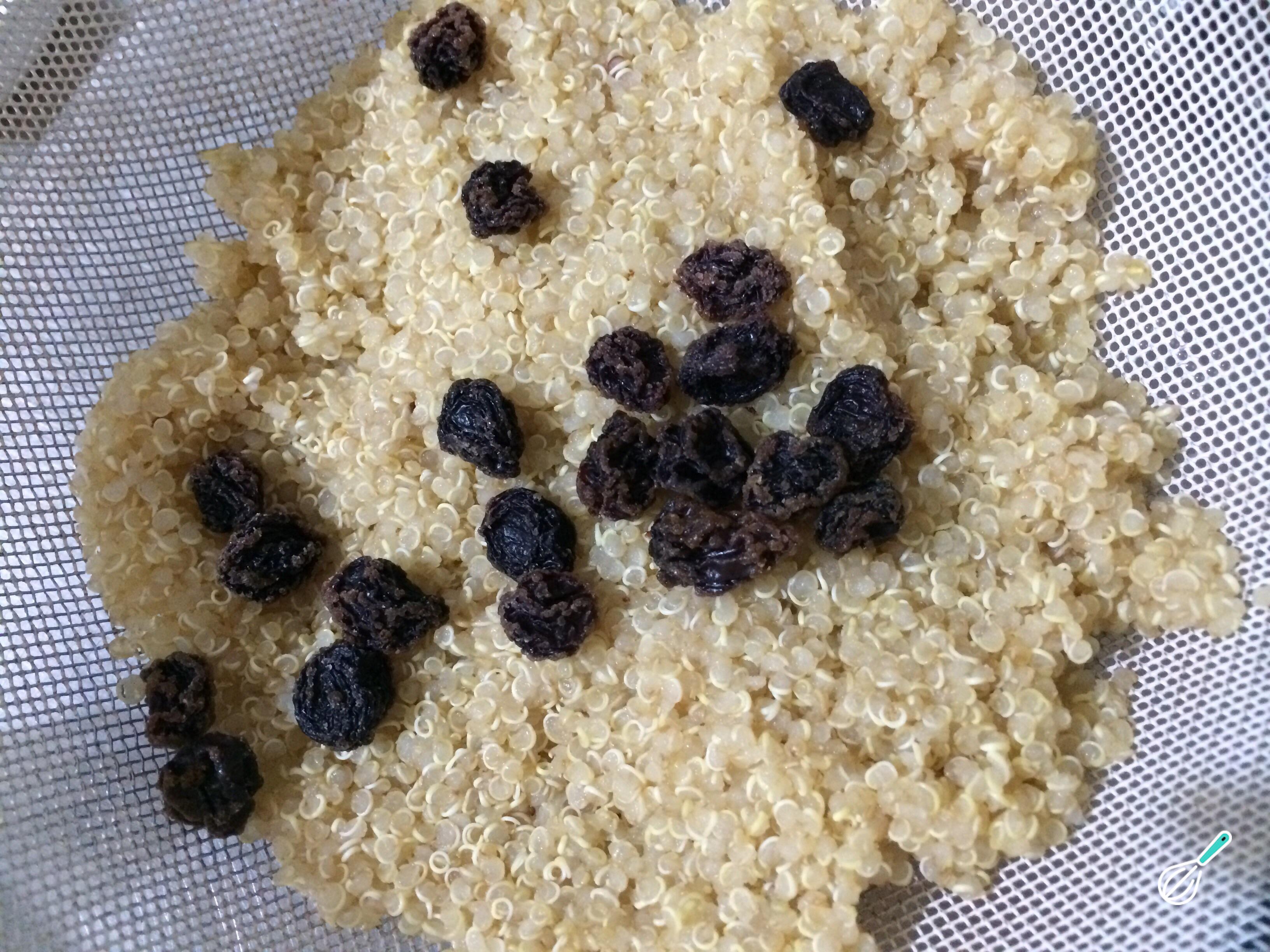 Quando a quinoa estiver cozinhada, o passo seguinte desta receita de quinoa doce com leite de amêndoas é escorrer e misturar com as uvas passas. Reserve.