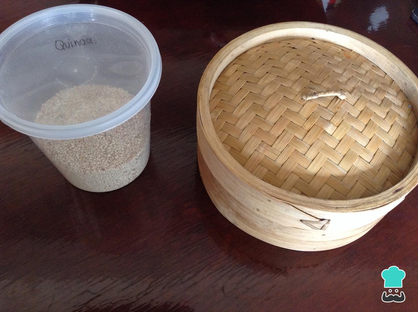 Dica: Para vaporizar a quinoa, vai precisar de uma base de bambu para cozimento a vapor, como a da imagem.