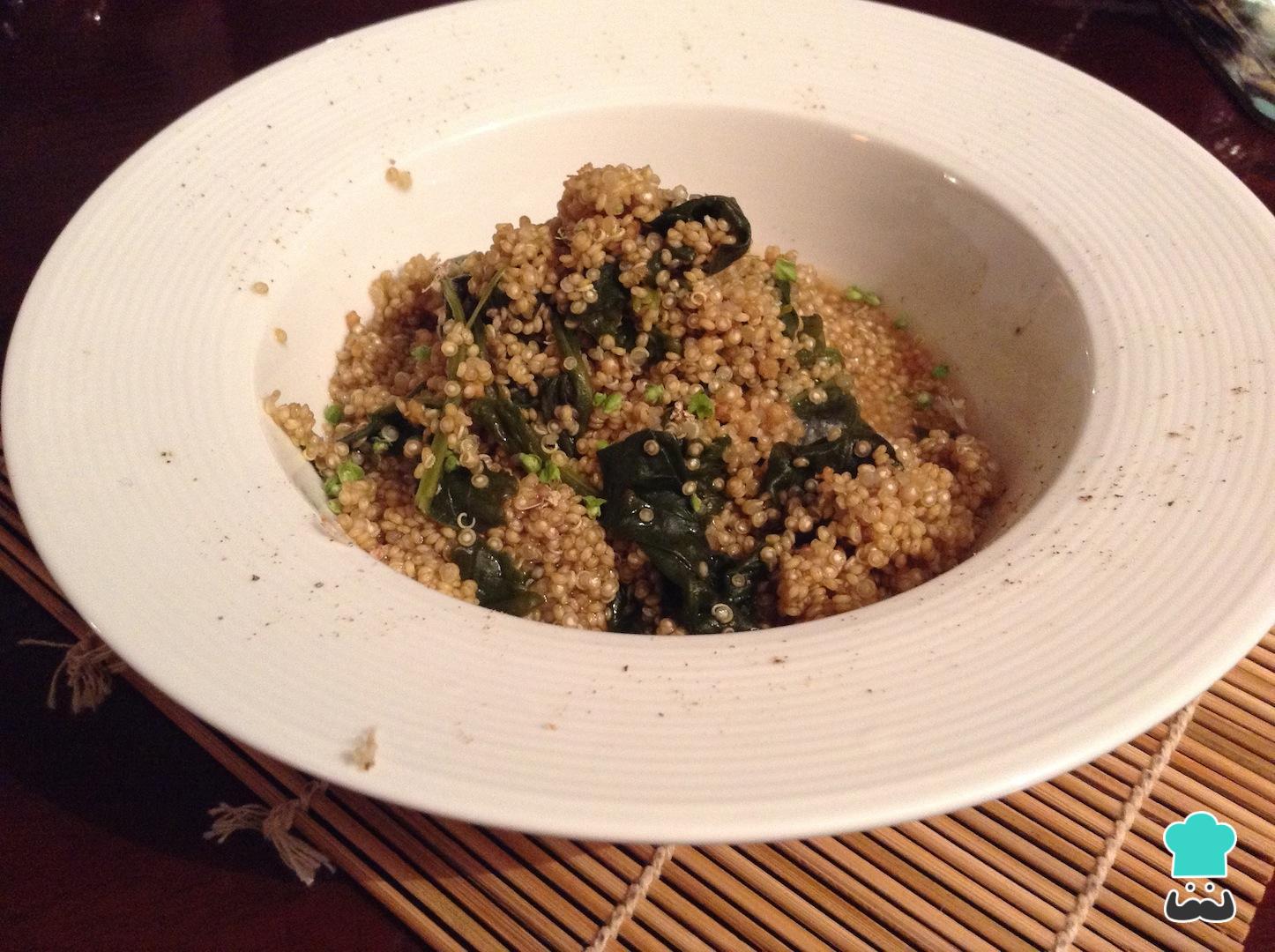 Coloque as folhas de espinafre na parte inferior da base de bambu e junte a xícara de quinoa por cima. Coloque a base de bambu na panela com água fervente e deixe cozinhar ao vapor por 20-30 minutos. Quando a quinoa estiver cozinhada, tempere com sal e pimenta do reino a gosto.