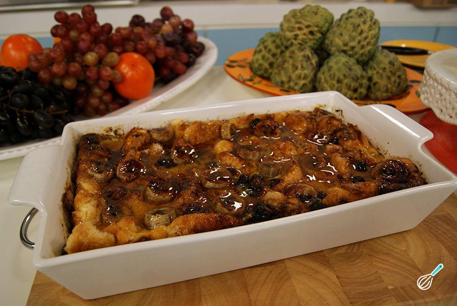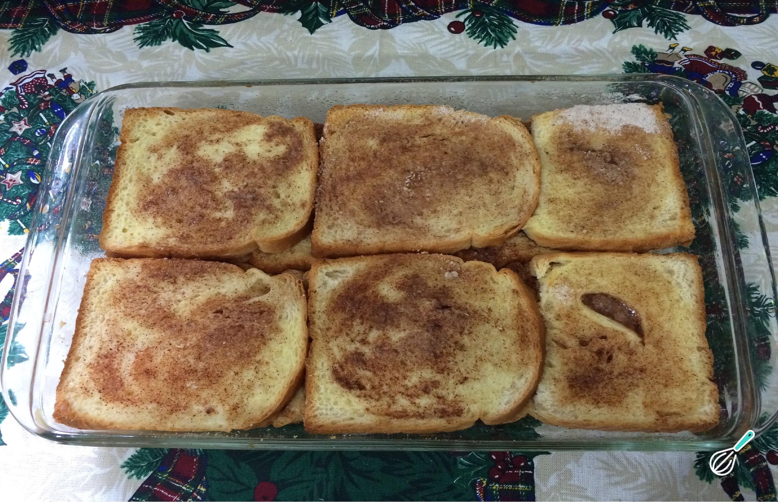 Coloque as fatias de pão em um pirex, cobrindo todo o fundo, e despeje a mistura do passo anterior no topo. Cubra com as fatias de banana e polvilhe com canela em pó. Asse em forno preaquecido até dourar (cerca de 30 minutos).