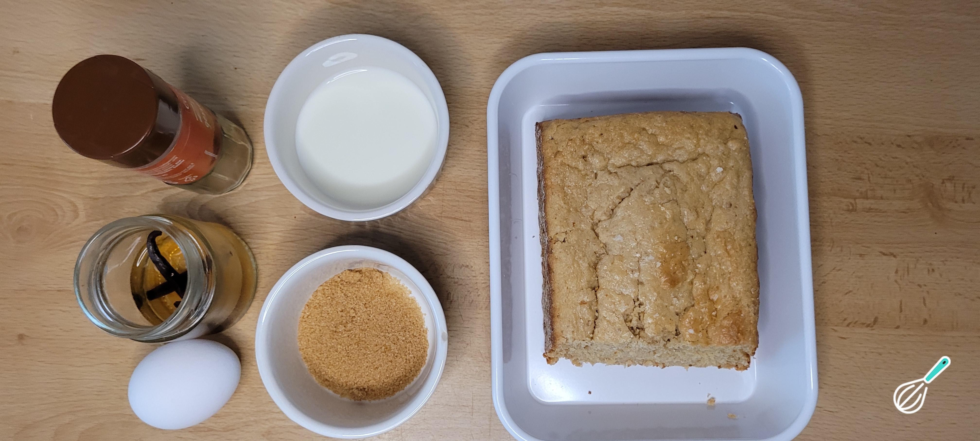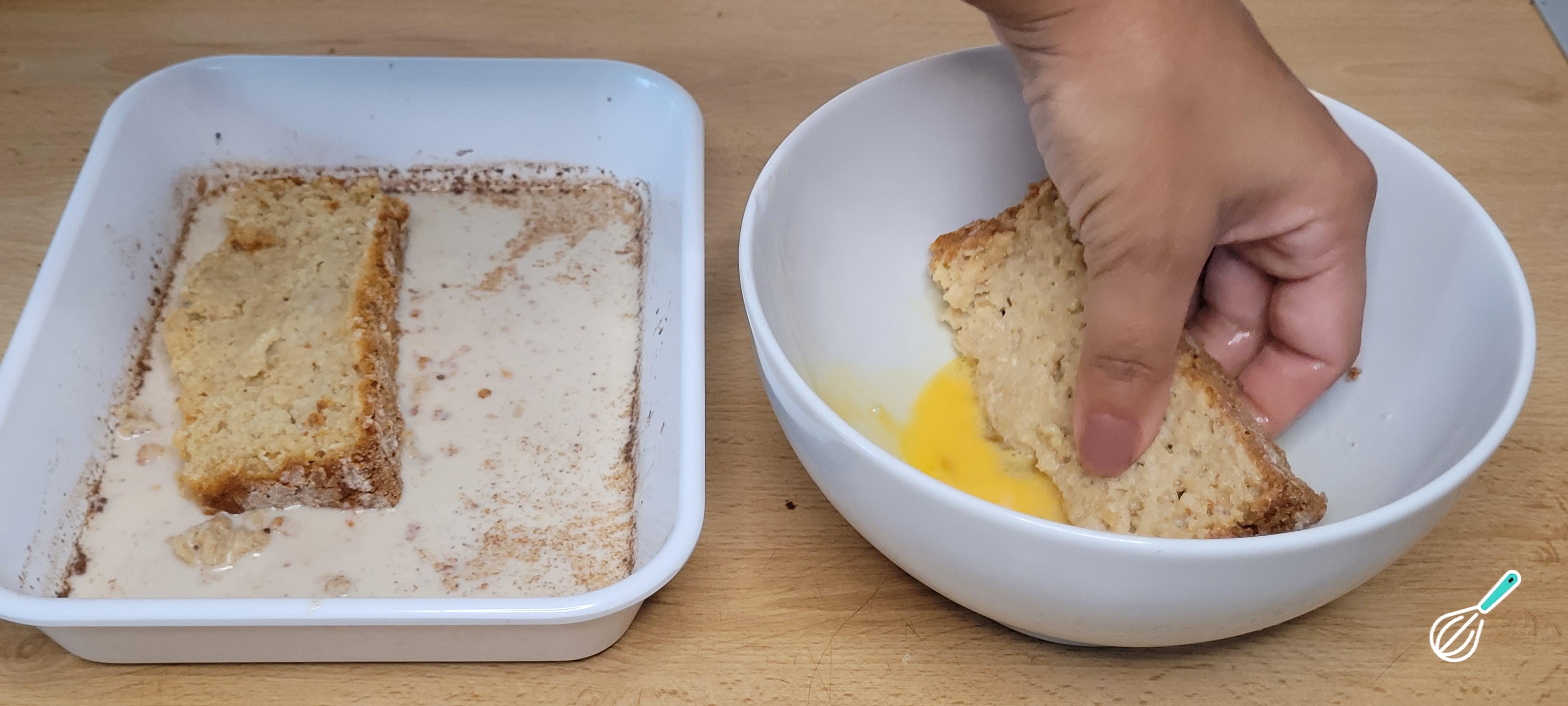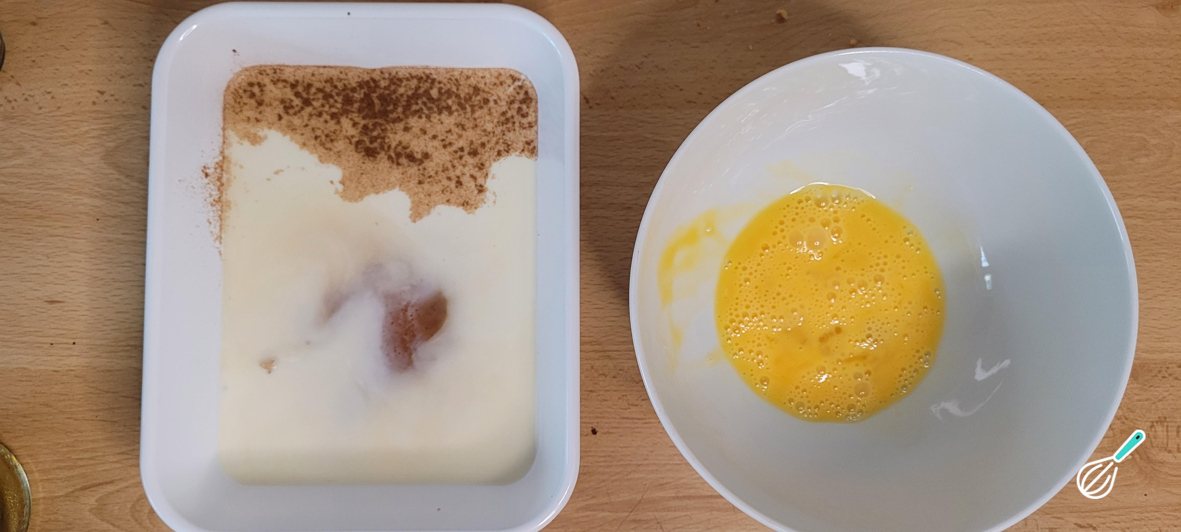Em uma tigela, misture o leite com canela em pó e extrato de baunilha. E bata o ovo separadamente em outra tigela.
