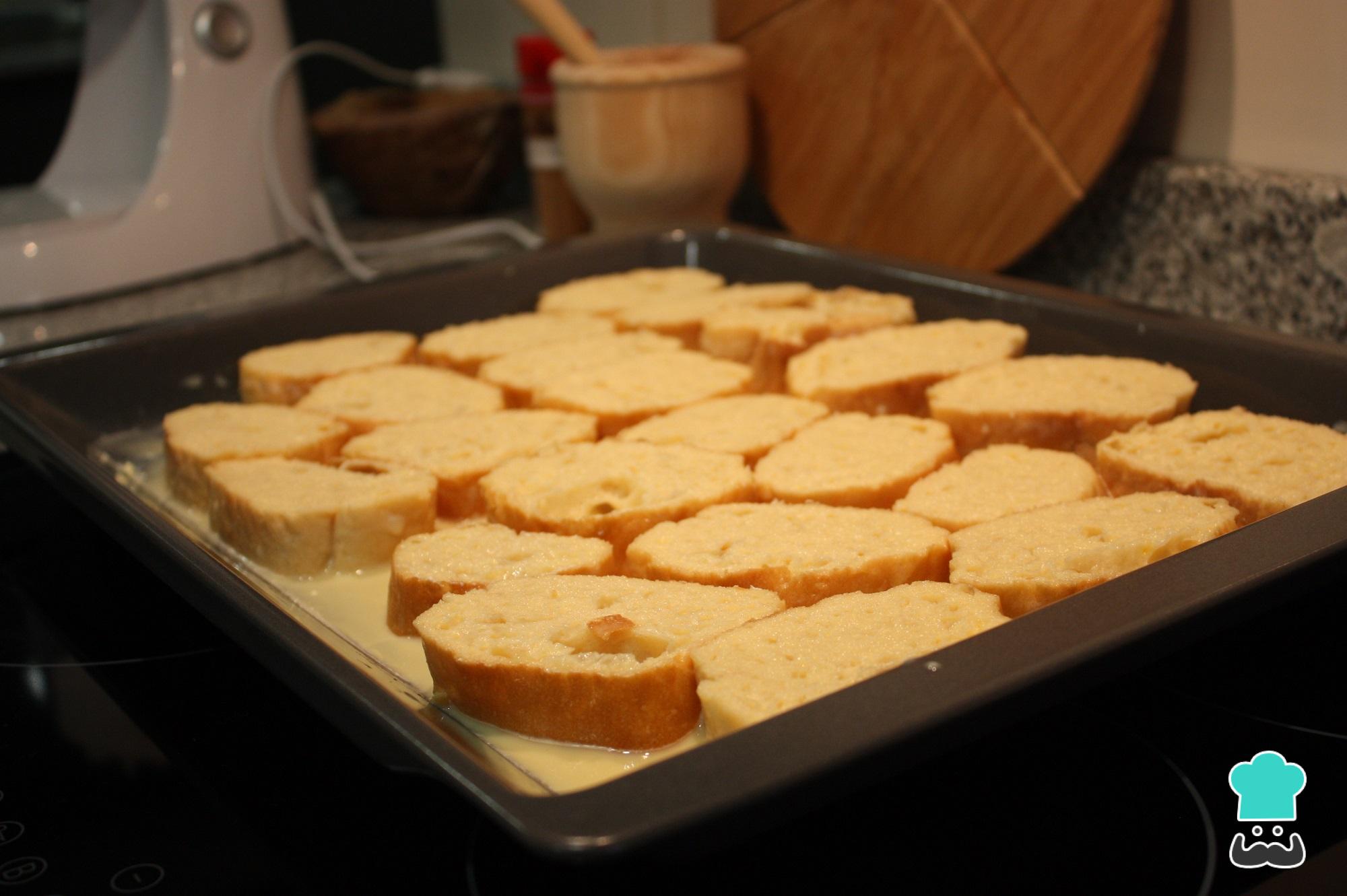 Mergulhe cada fatia de pão na mistura de leite e, depois, no ovo batido. Coloque numa assadeira ou tabuleiro untado com o azeite, e leve ao forno preaquecido a 180ºC por 8 minutos, virando na metade do tempo, para que dourem do outro lado também.