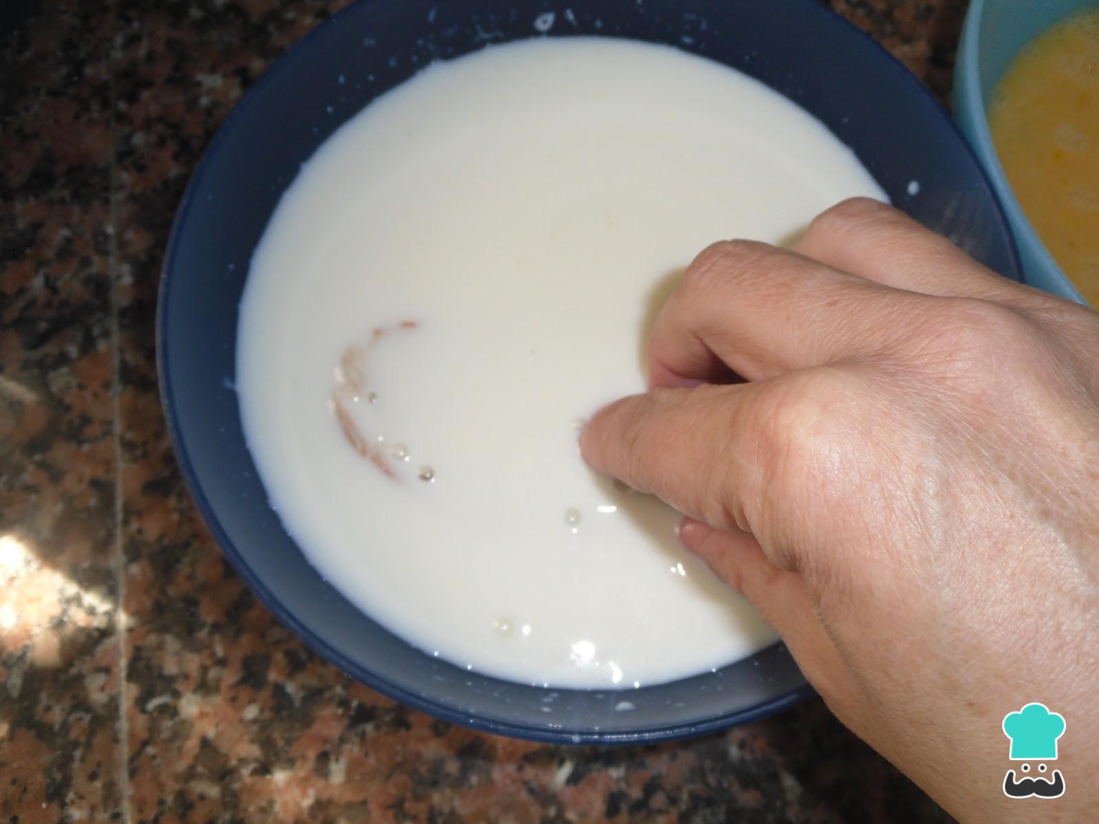 Para fazer essa rabanada simples e fácil, comece por cortar os pães em fatias grandes. Coloque-as de molho em uma vasilha com leite. Enquanto isso, bata os ovos com um garfo e aqueça bastante óleo na frigideira.