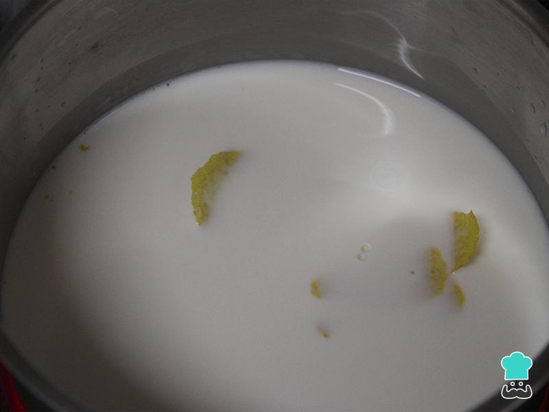 Em uma panela coloque o leite, o açúcar, a casca de 1 limão e leve ao fogo para levantar fervura.