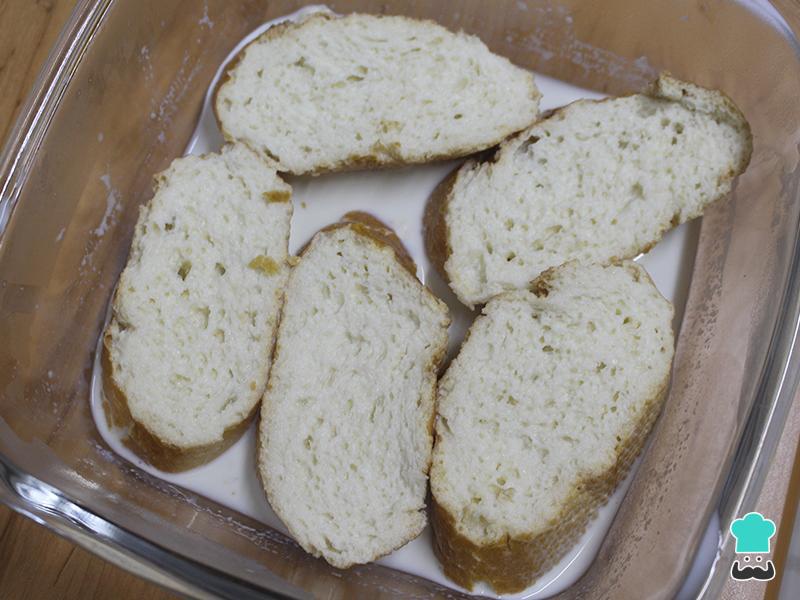 Depois do leite levantar fervura, retire as cascas de limão e coloque o leite num recipiente grande. Adicione as fatias de pão e deixe o pão absorver o leite.