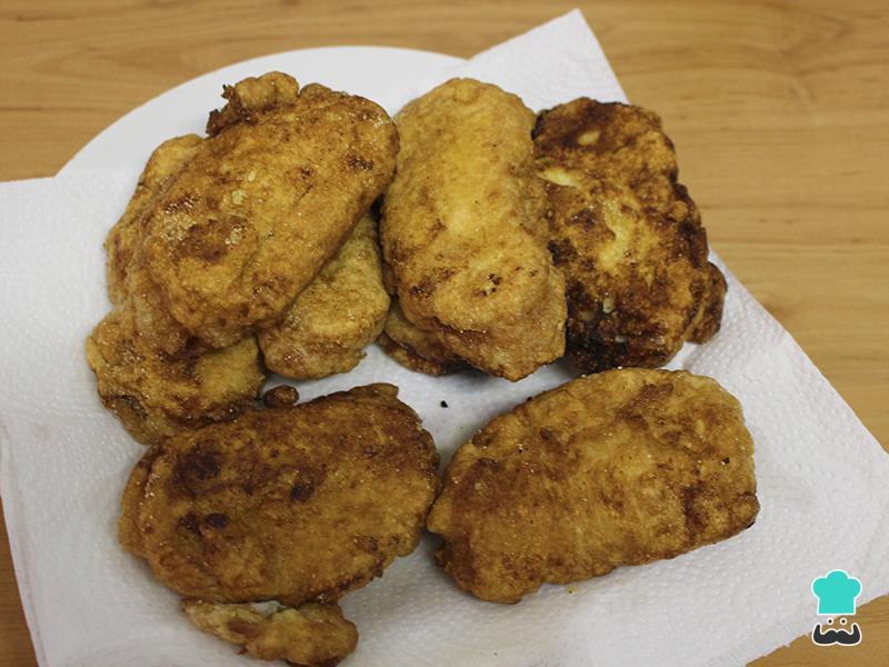 Coloque o pão fritando até ficar dourado dos dois lados. Retire as rabanadas prontas para um prato forrado com papel de cozinha, para absorver o excesso de azeite. Continue fritando as fatias de pão restantes.