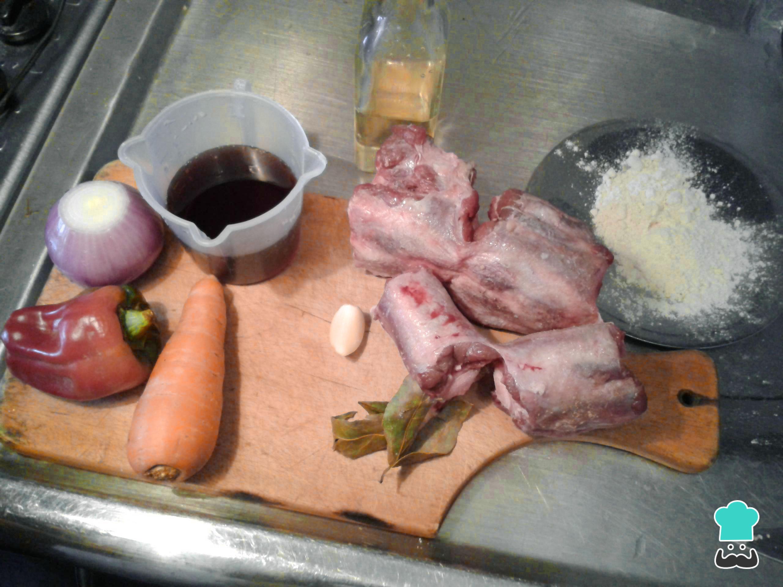 Comece separando todos os ingredientes desta receita de rabo de touro espanhol. Lembramos que, se você não encontrar rabo de touro para comprar, pode preparar a receita do mesmo modo usando rabo de boi ou de vaca.