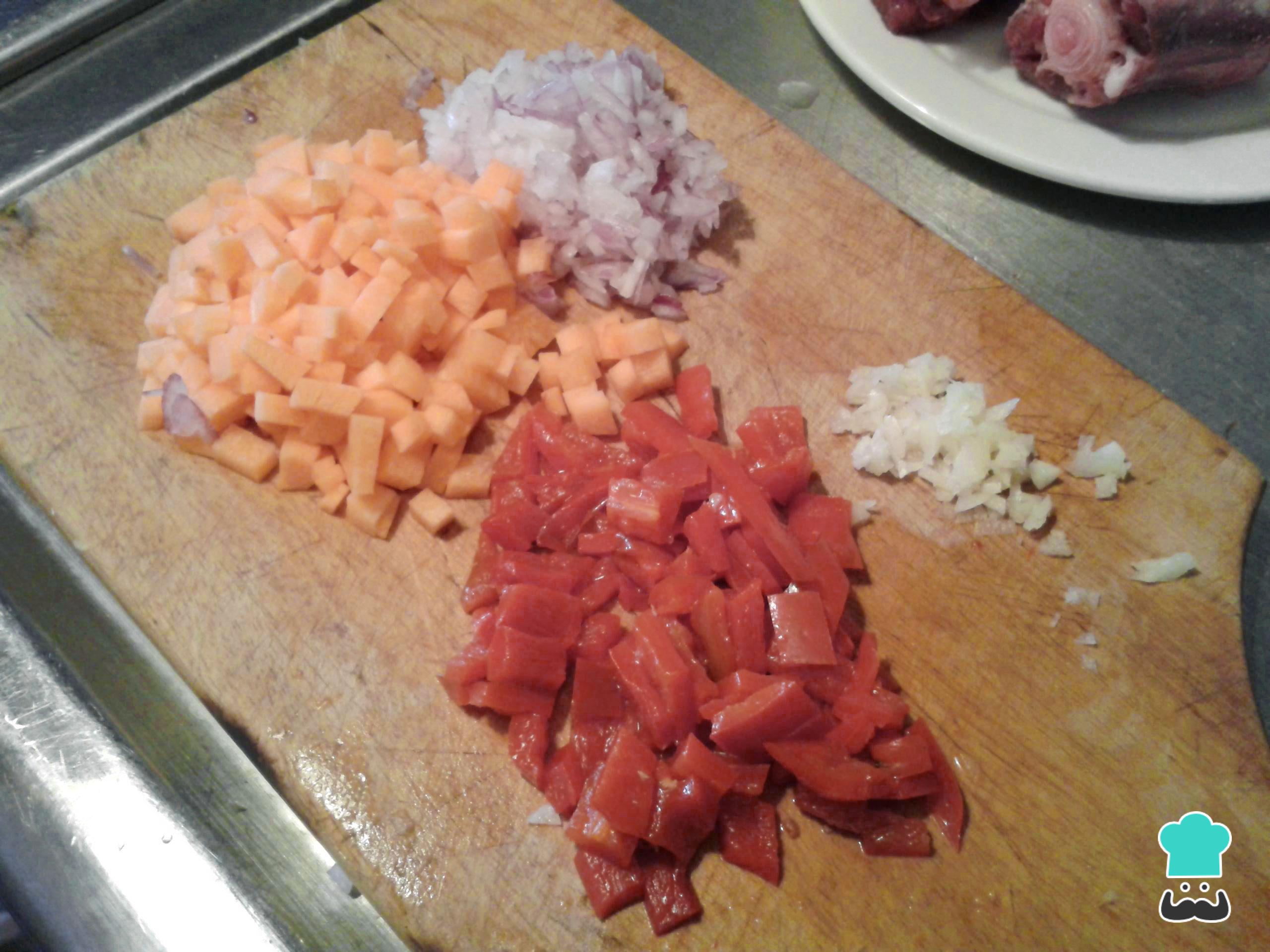 Descasque a cebola, a cenoura e os alhos. Corte esses ingredientes em pedaços juntamente com o pimentão, descartando as sementes do pimentão.
