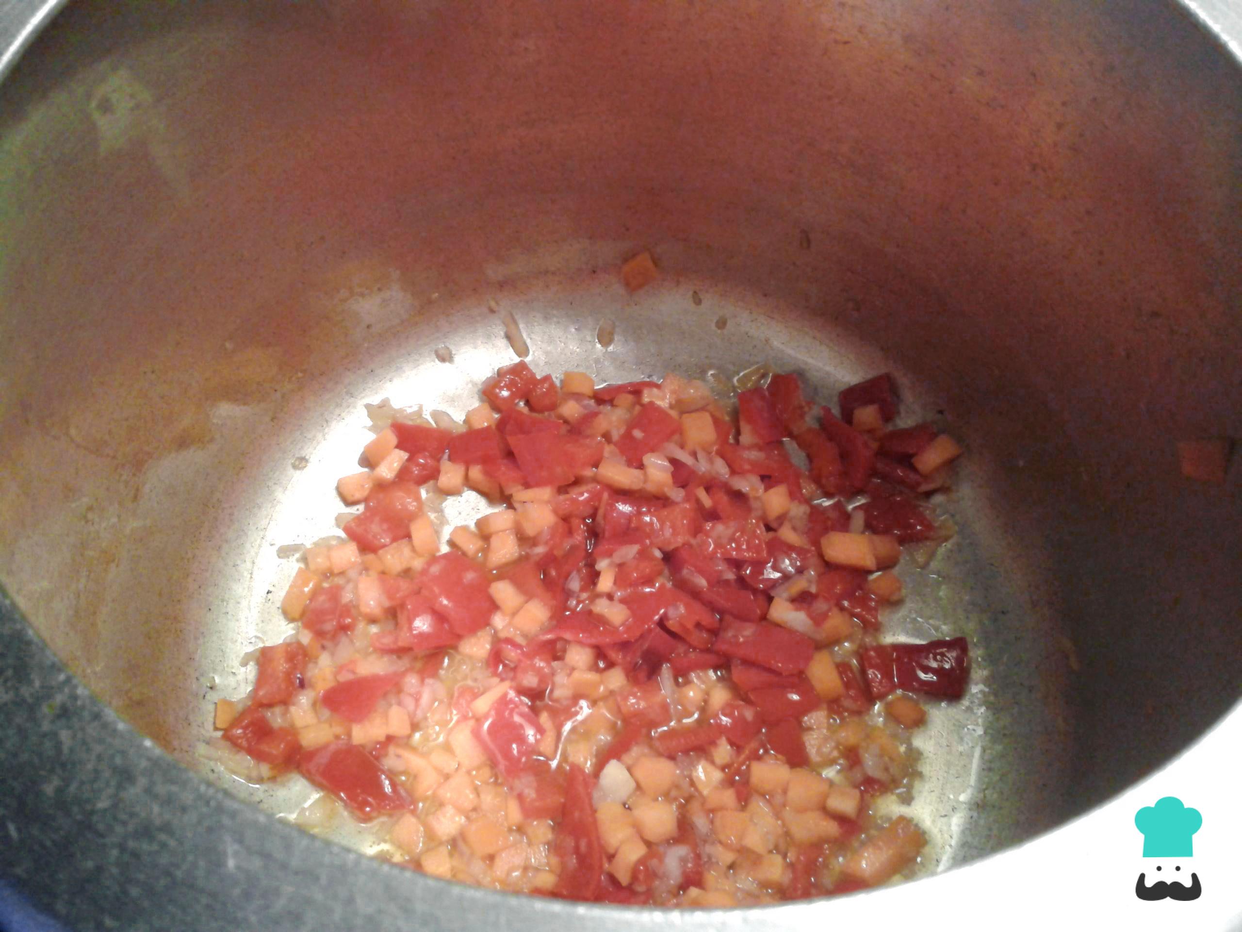 Leve ao fogo uma panela de pressão com um fio de óleo e, quando estiver quente, coloque os ingredientes anteriores para preparar um refogado para o rabo de touro. Mexa e deixe cozinhar no fogo médio-baixo até começar a dourar.