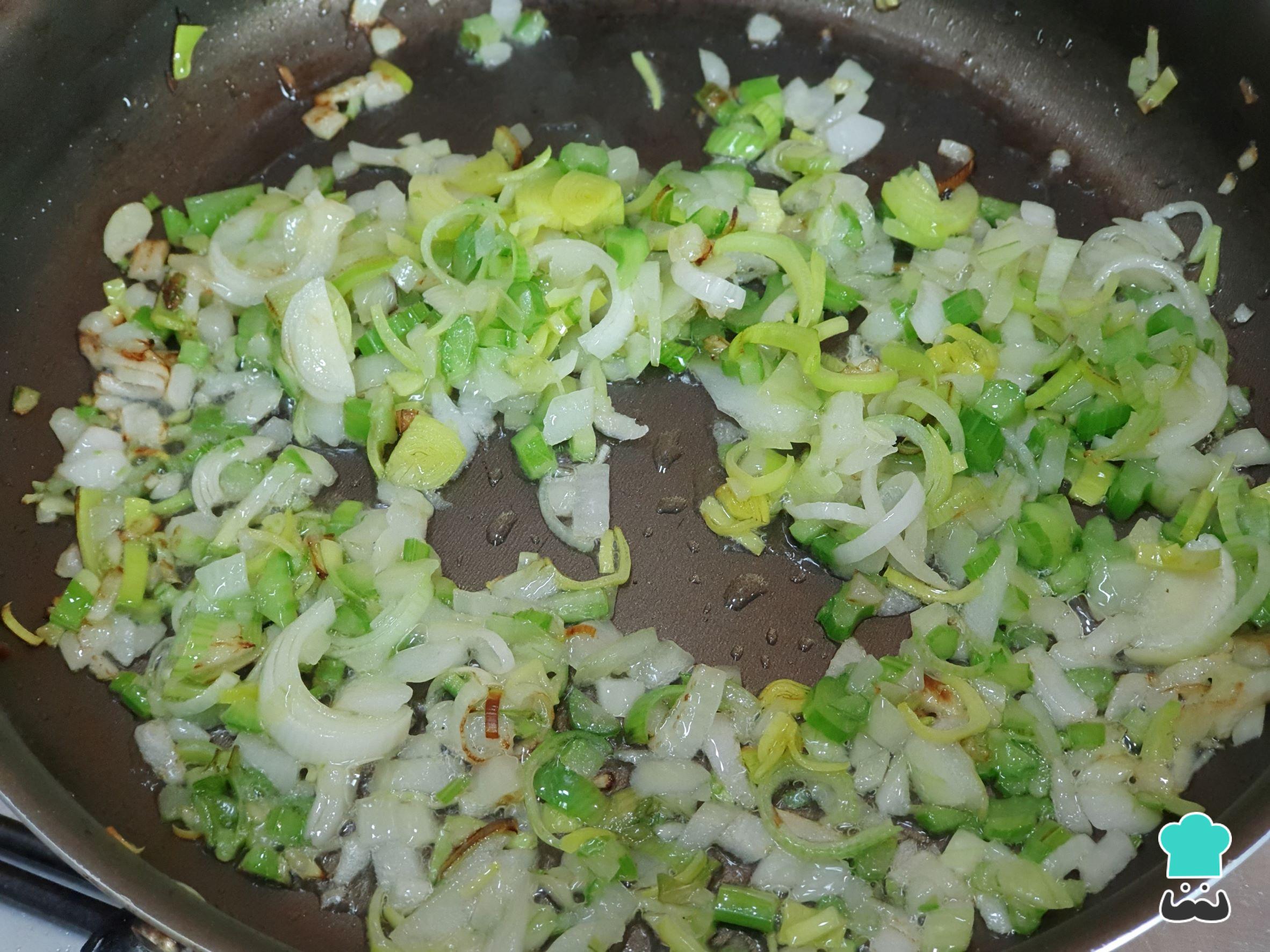 Em uma panela com azeite de oliva refogue o salsão, alho poró e a cebola até que estejam macios e levemente dourados.