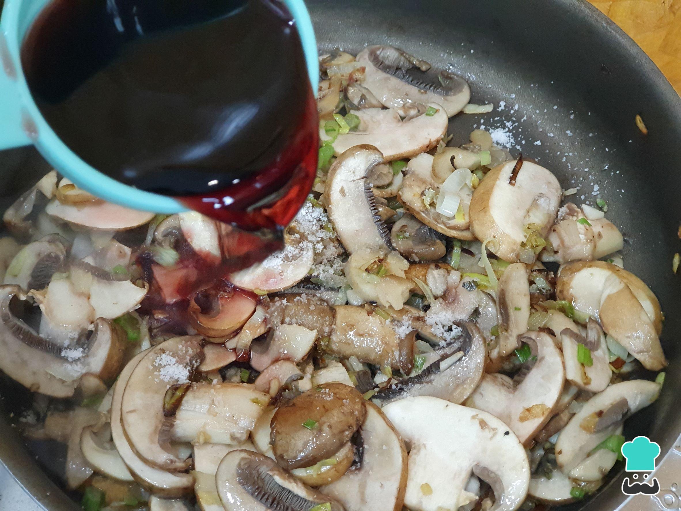 Quando os cogumelos começarem a amaciar, junte o vinho e acerte o sal.