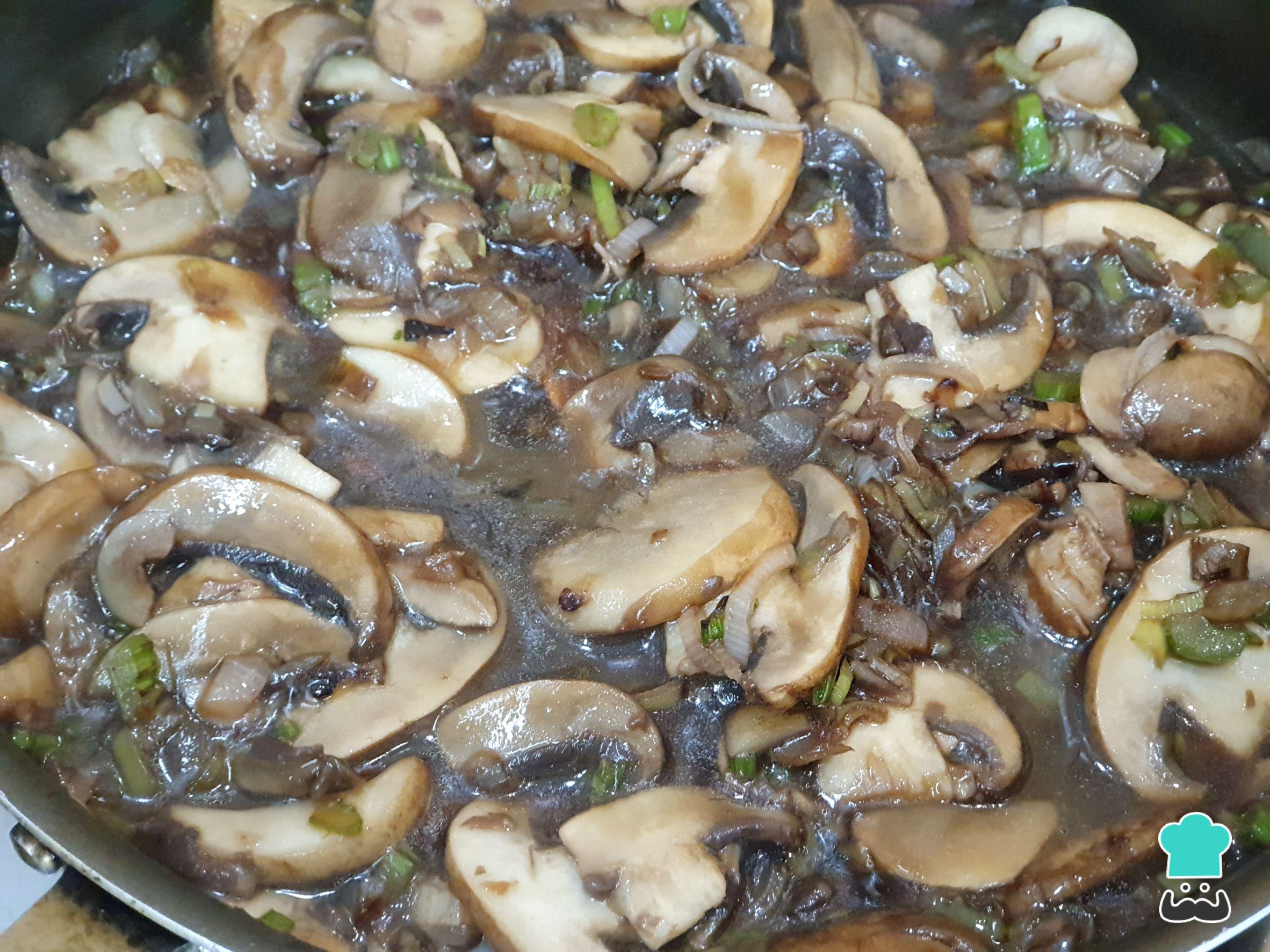Cozinhe até que o álcool evapore e fique somente o sabor do vinho. Os cogumelos irão desprender líquido e se formará um molho aromático e perfumado.