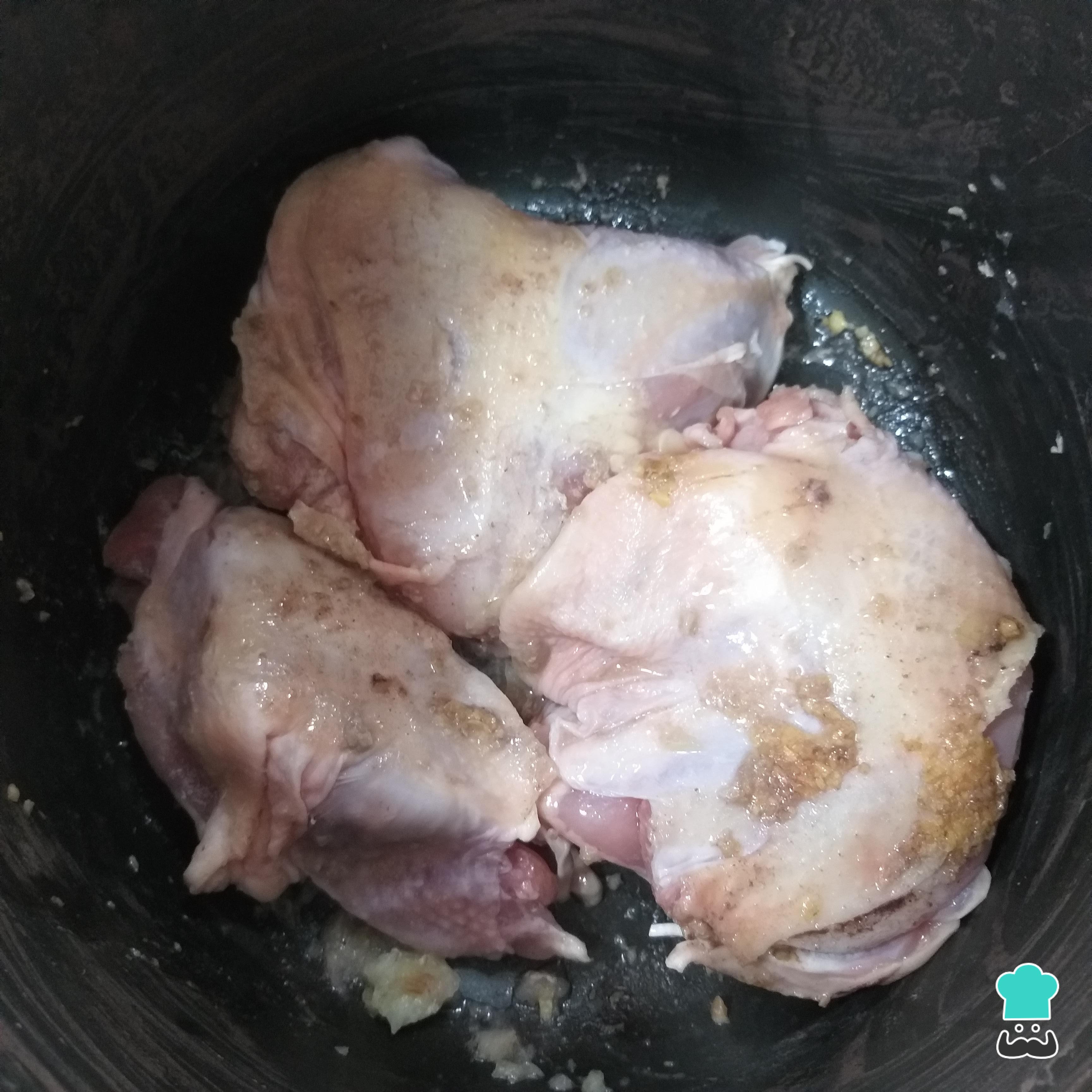 Após refogar, coloque o frango e doure de todos os lados - confira nossas dicas sobre como desossar coxa de frango.