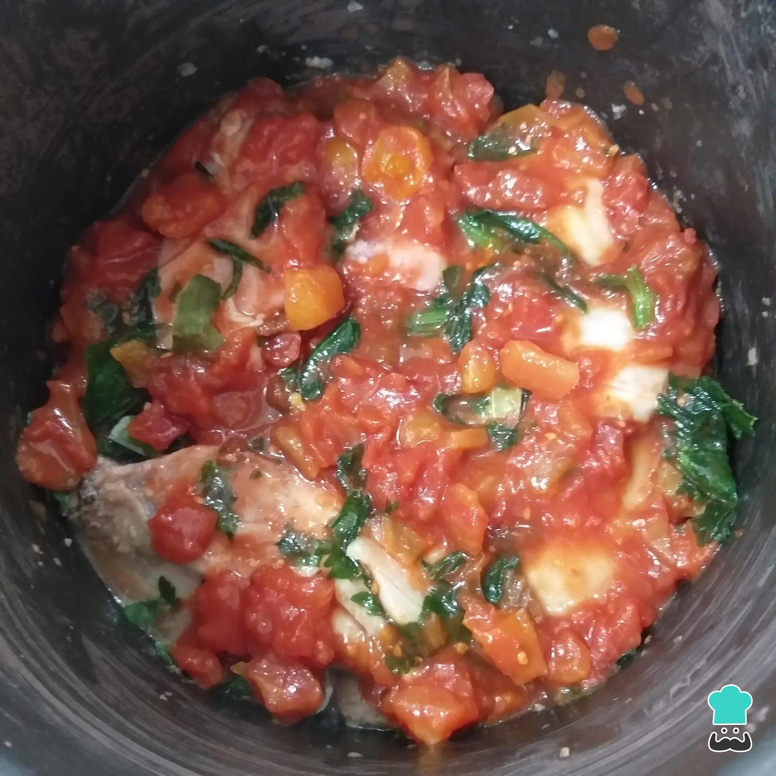 Cubra o frango com o tomate pelado e adicione os demais ingredientes (louro, salsão e pimenta). Tampe a panela e cozinhe por 20 minutos após a panela apitar ou até que o frango esteja desmanchando.