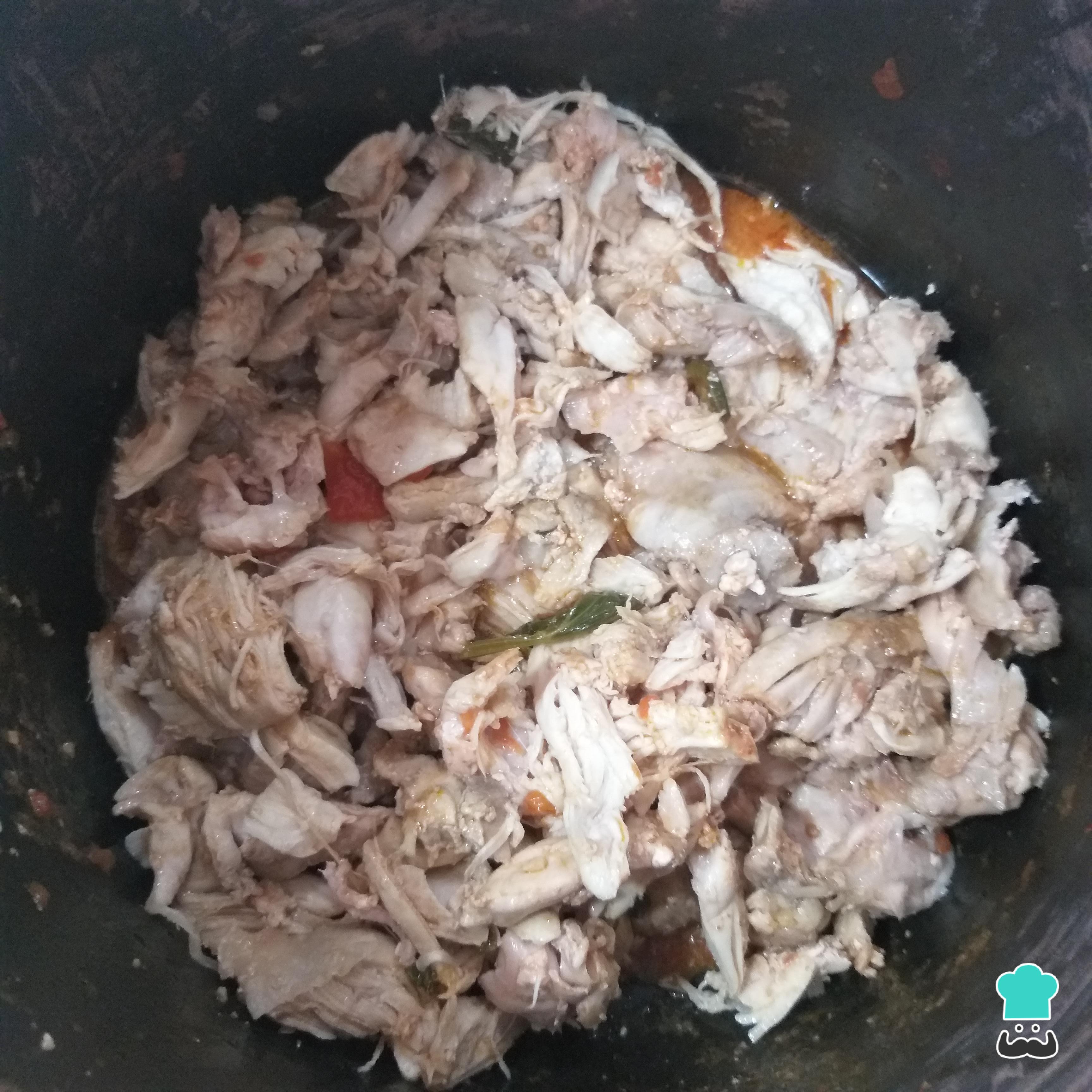 Depois desse tempo espere a pressão sair. Desfie o frango e retorne à panela, cozinhando sem a pressão para reduzir um pouco o caldo. A seguir, retire o frango e reserve-o.