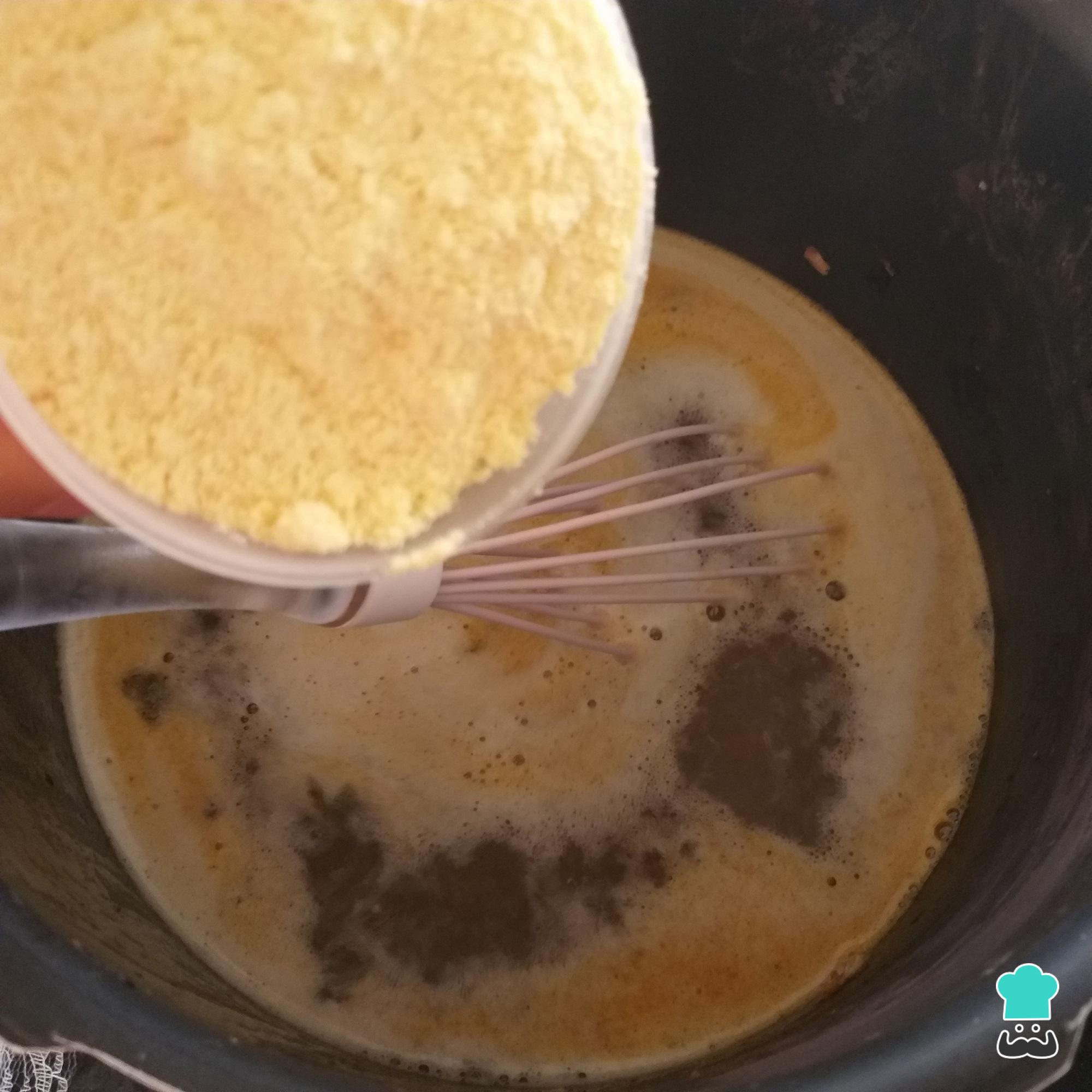 Coloque a água na mesma panela de pressão e leve ao fogo alto. Quando começar a ferver, acrescente um pouco mais de sal e junte o fubá aos poucos, mexendo com um batedor de arame (fouet).
