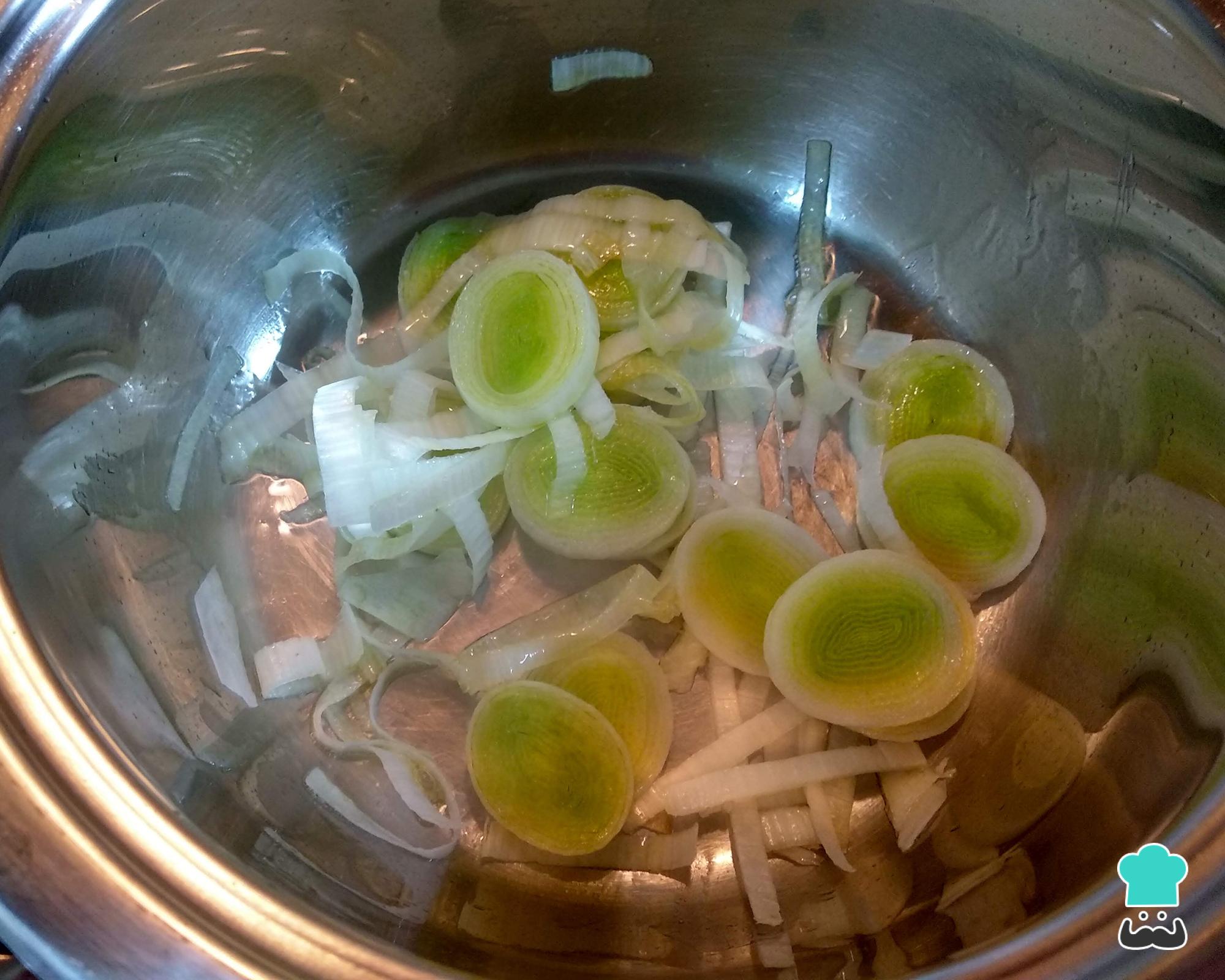 Comece preparando o refogado: leve ao fogo baixo uma panela com o azeite ou óleo, coloque o alho poró picado e deixe até ficar transparente.