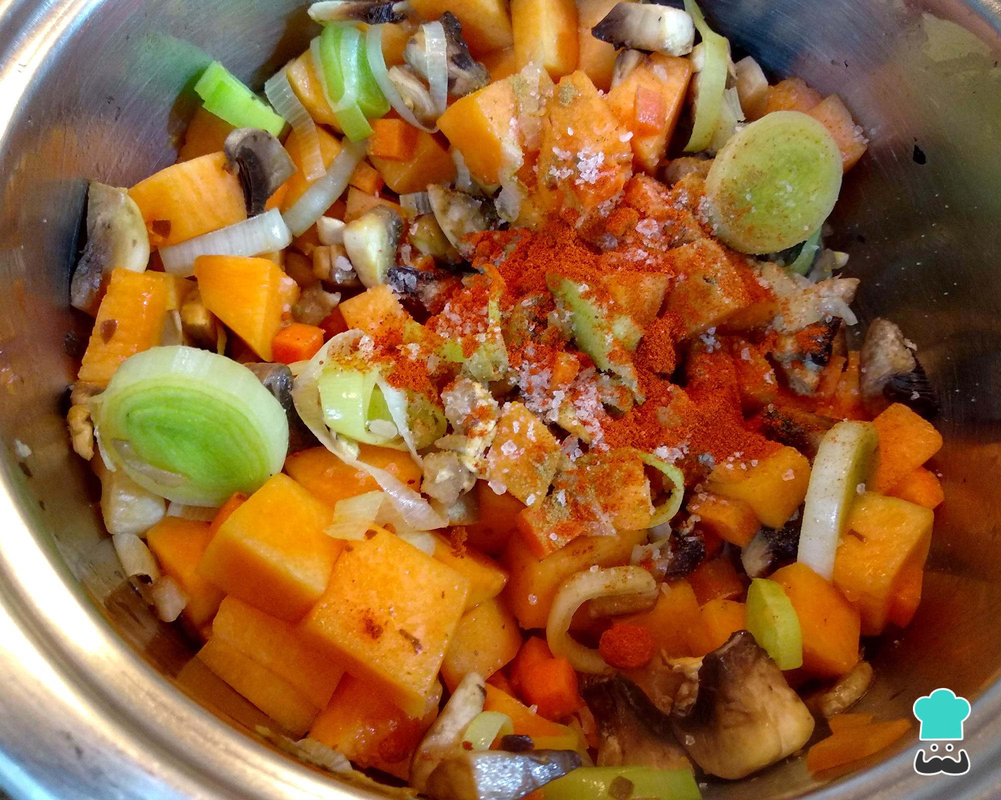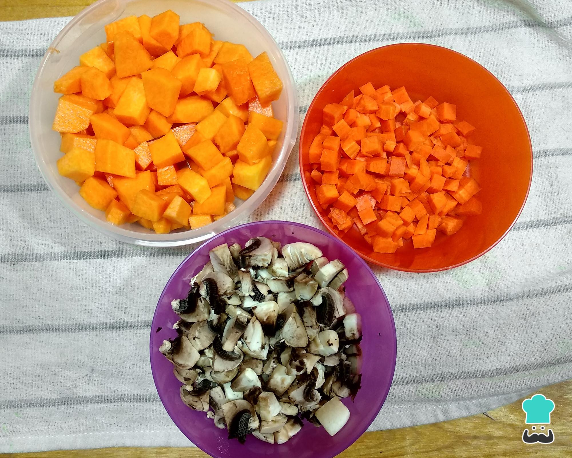 Enquanto isso prepare os restantes legumes: descasque a cenoura e a abóbora e pique em pedaços. Limpe os champignons e pique em pedaços também, como na foto.