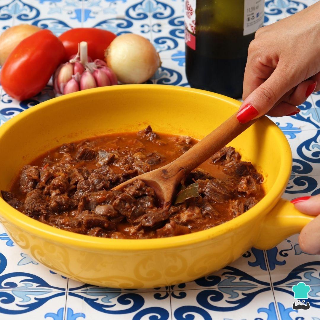 Em seguida despeje o molho de tomate, o vinho, a água e as folhas de louro. Acerte o sal se necessário e misture bem. Volte a carne para a panela, tampe e cozinhe por 50 minutos a partir do momento que a panela apitar.