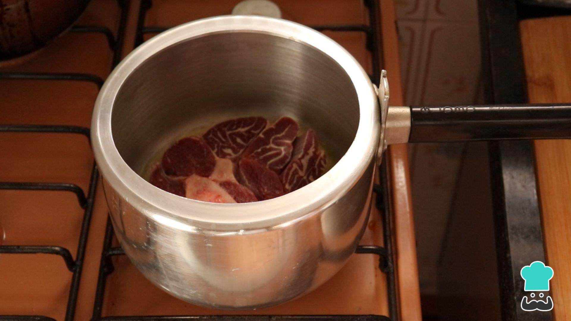 Leve uma panela de pressão sem tampa ao fogo alto. Quando aquecer despeje o azeite e sele todos os pedaços de ossobuco.