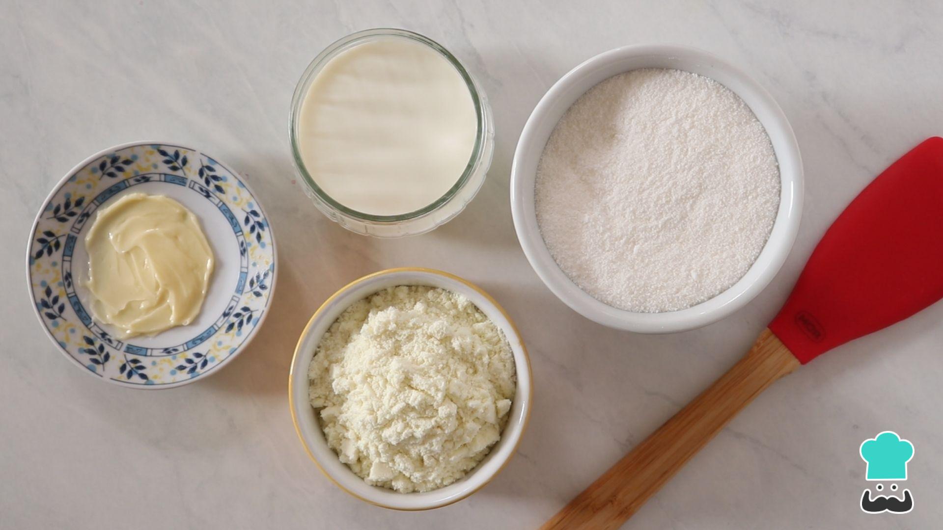 Separe os ingredientes desta receita de rapadura branca, que são somente 4: açúcar, leite integral, leite Ninho e manteiga.