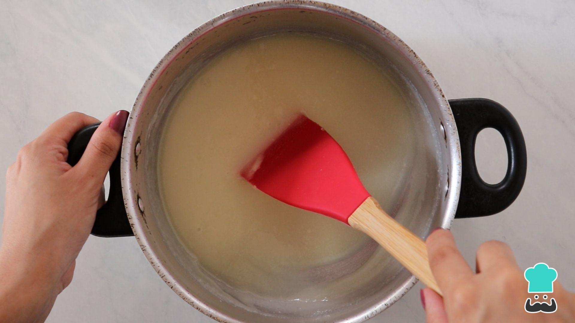Leve ao fogo baixo e mexa até começar a ferver e desgrudar do fundo da panela, como na foto.