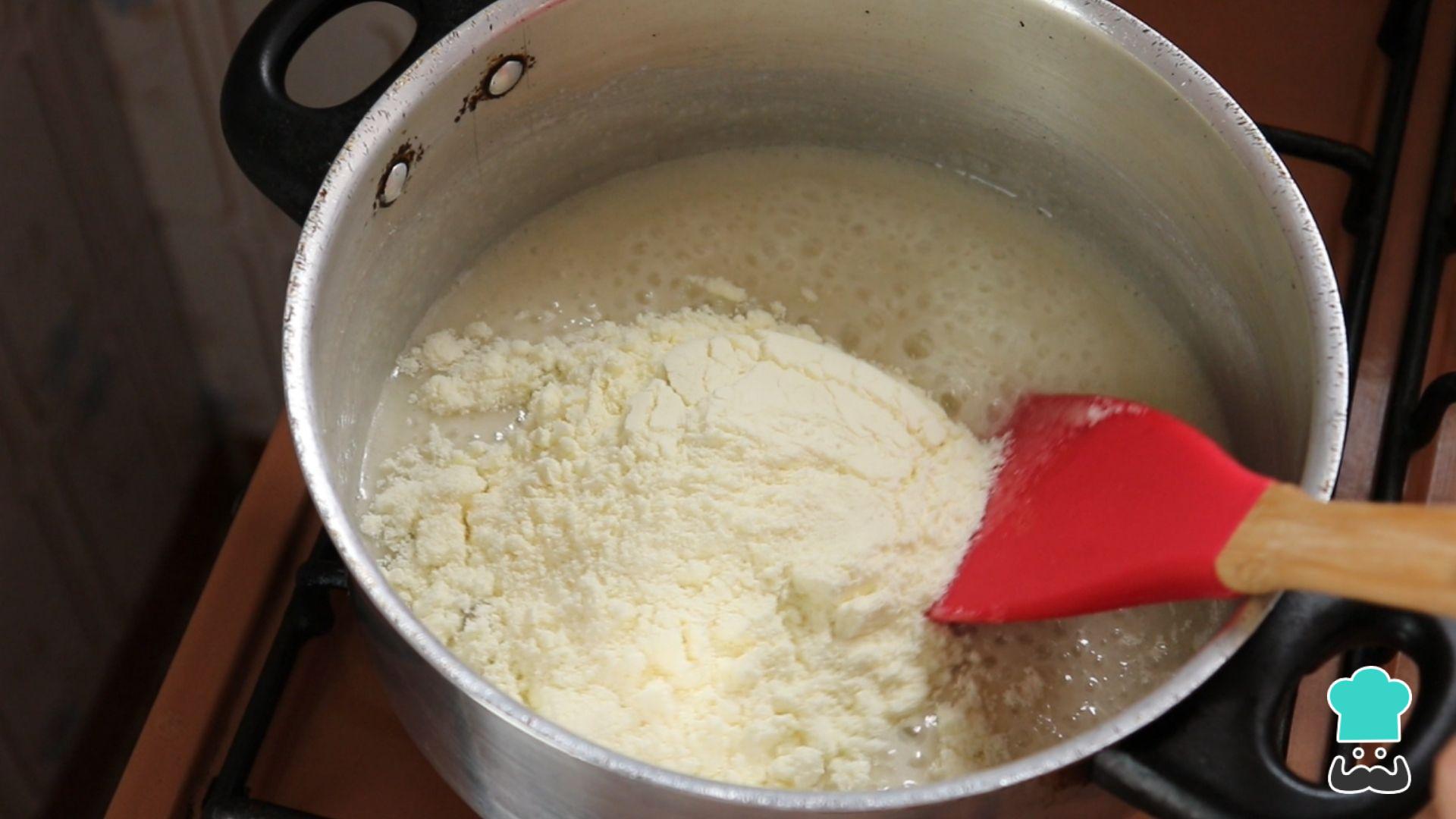 Despeje o leite em pó de uma só vez e mexa bem até incorporar.