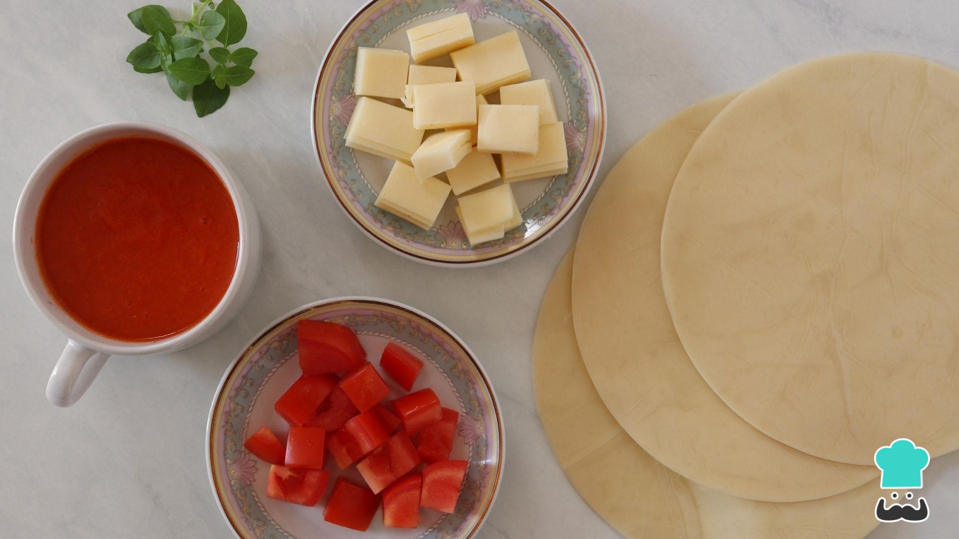 Separe os ingredientes e corte o tomate e a muçarela em cubos. O molho de tomate pode ser pronto ou uma versão caseira - clique para ver como fazer molho de tomate caseiro.