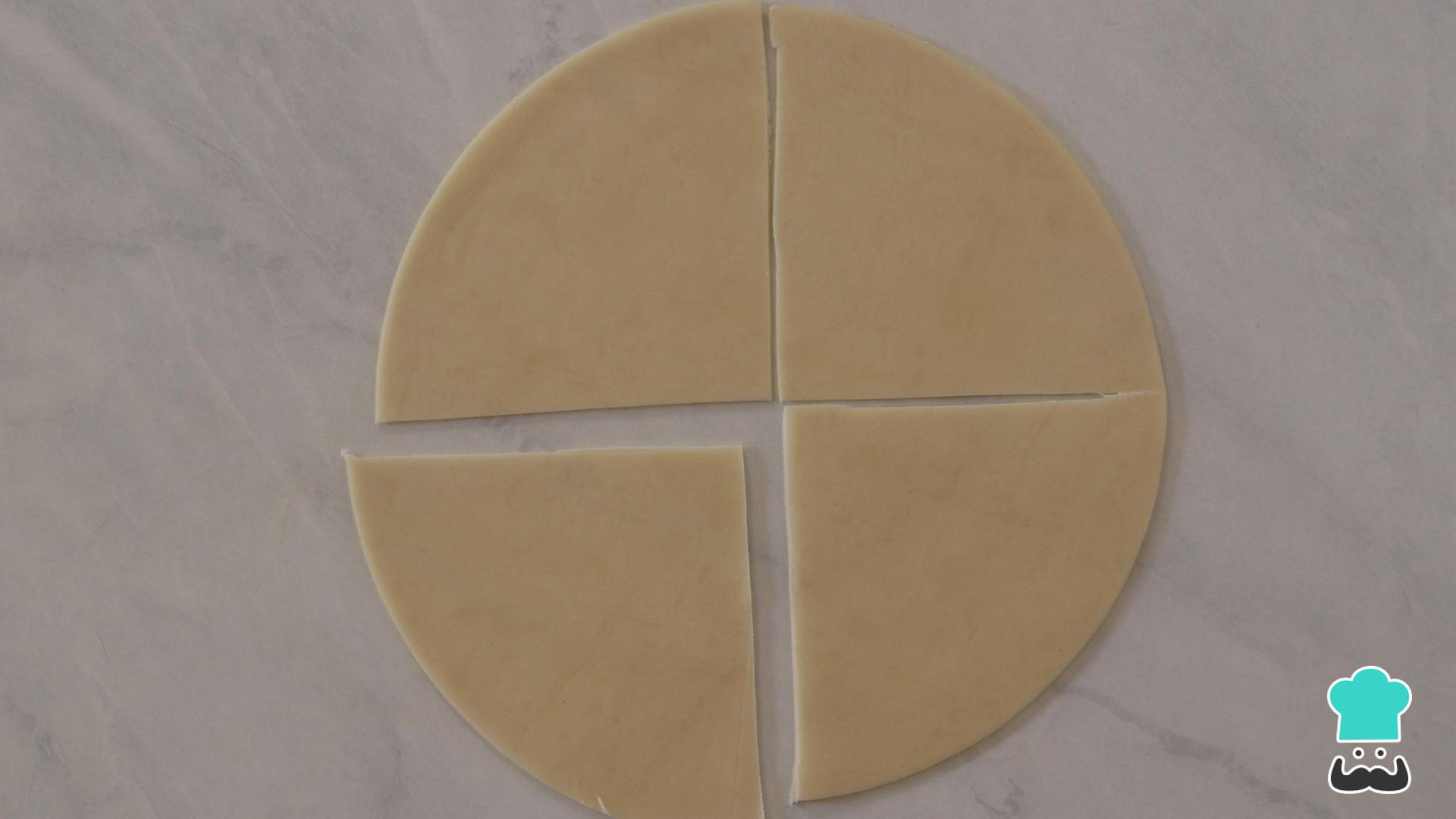 Aqui nós estamos usando massa de pastel redonda. Para os raviólis não ficarem muito grandes, divida o disco em 4 partes iguais. Para um prato individual, 6 discos de massa de pastel são suficientes.