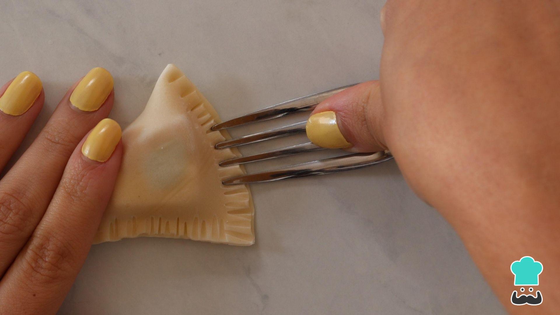 Sele a massa da mesma forma que se faz com pastel, com ajuda de um garfo. Caso a sua massa esteja ressecada, molhe as pontas dos dedos (mas só um pouquinho) e passe por toda a borda. Isso vai ajudar a selar melhor.