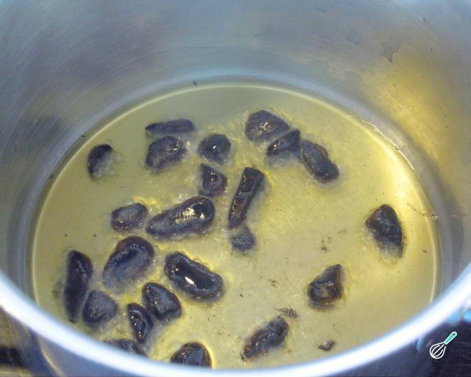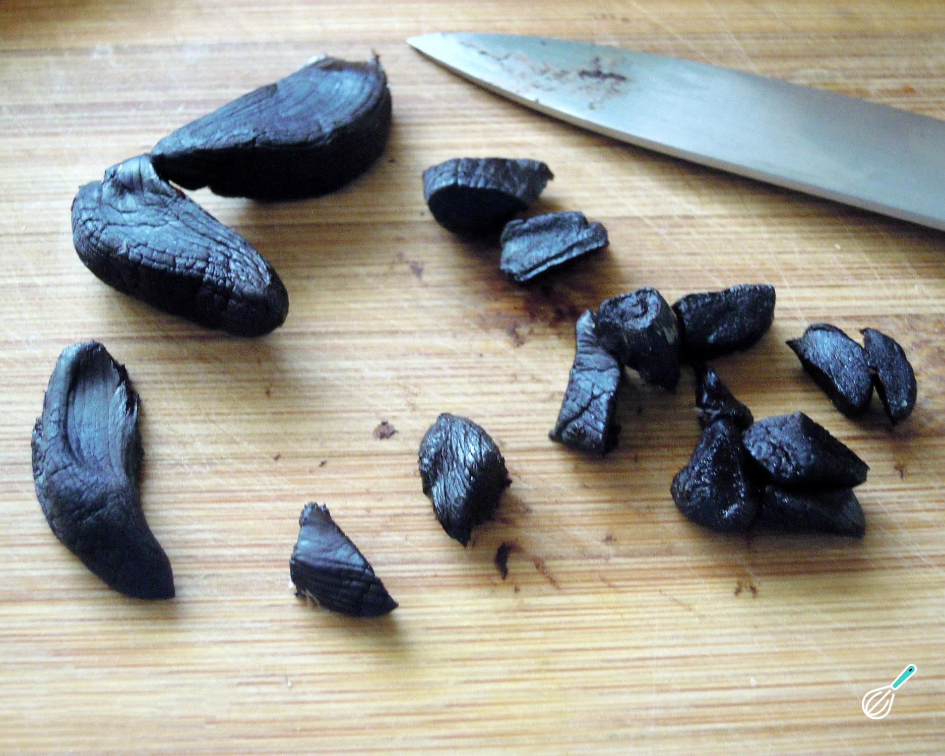 O primeiro passo para preparar esta sopa de alho negro é descascar e cortar os alhos negros em fatias.