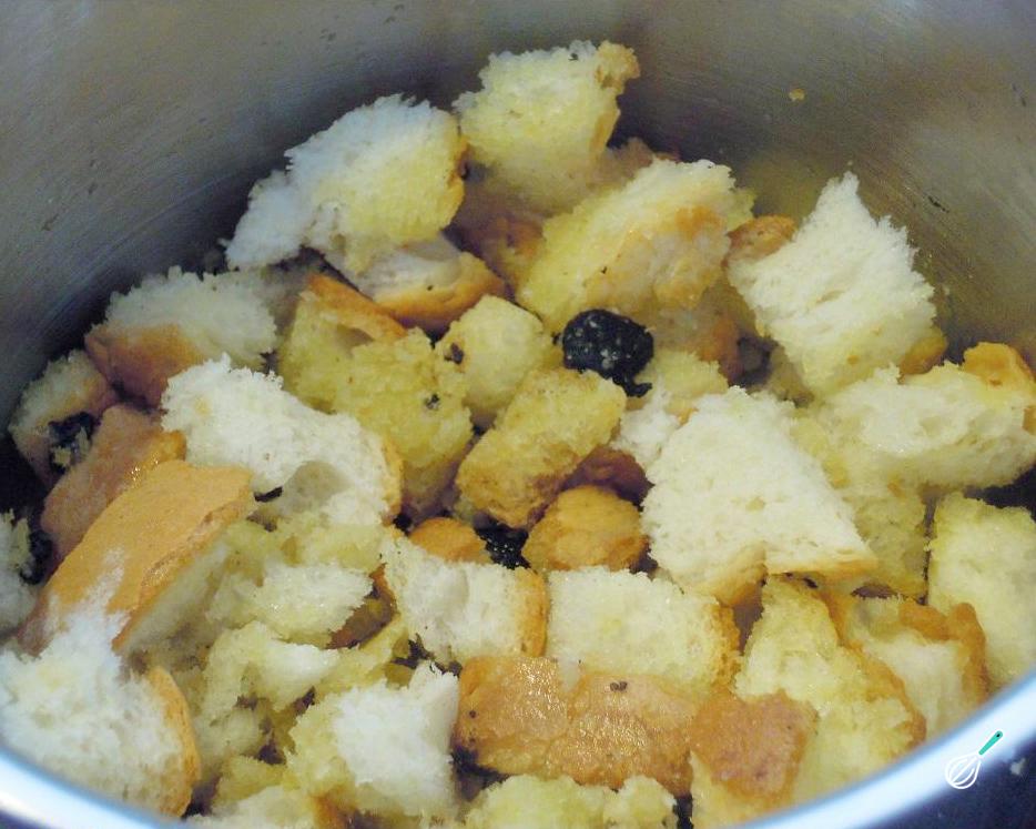 Depois dos alhos fritos, junte o pão e misture. Tempere com a páprica ou colorau e coloque sal a gosto e deixe cozinhar até o pão absorver o azeite e começar a dourar.