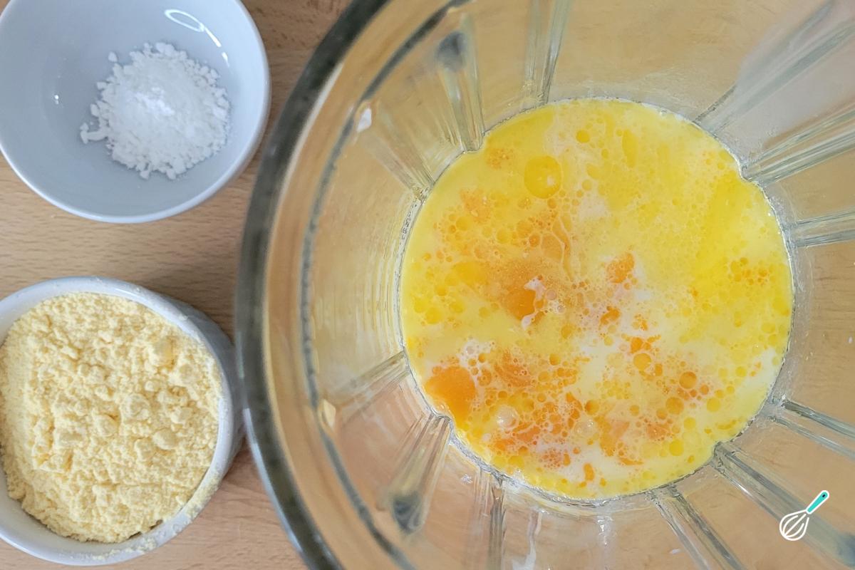 No liquidificador, coloque os ovos, a manteiga derretida, o leite e o açúcar e bata bem até ter uma massa homogênea.