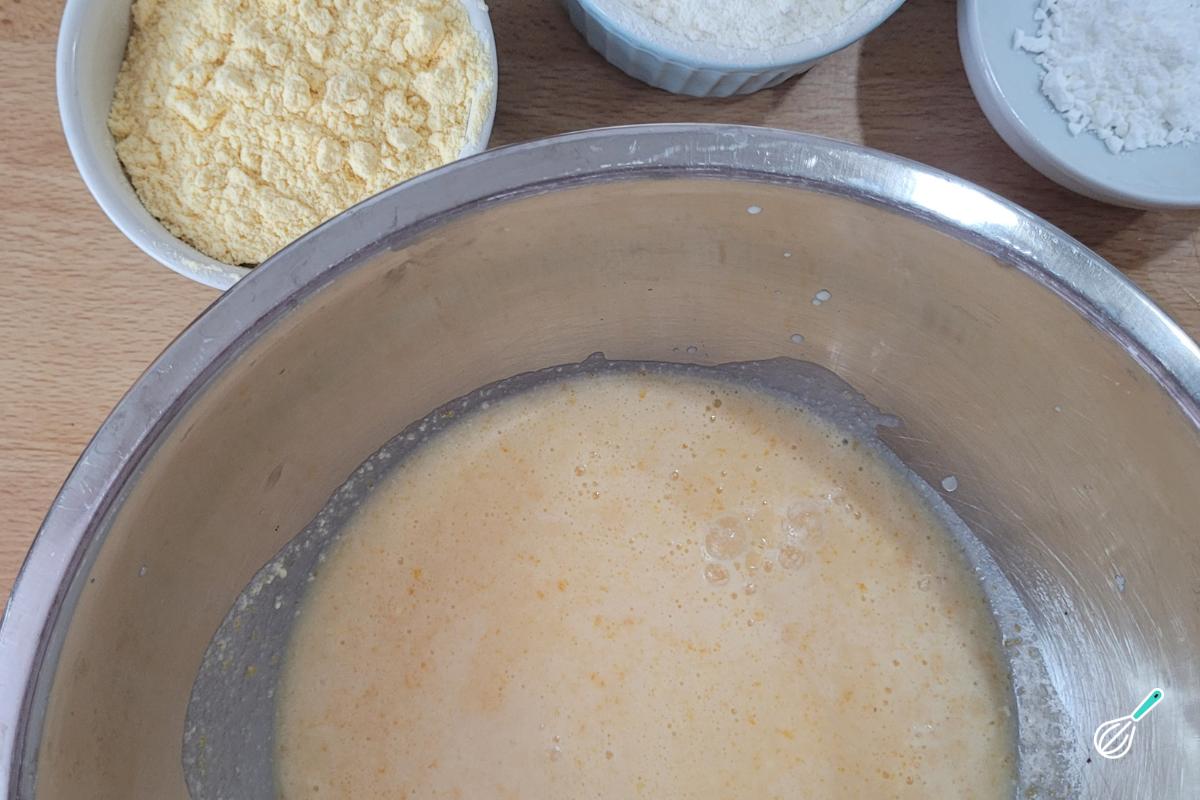 Comece adicionando o fubá e misture bem com um batedor de arame até que não fiquem mais gruminhos na massa. Adicione em seguida a farinha de trigo e misture bem novamente, mas sem bater demais para não desenvolver o glúten. Por fim, coloque o fermento e misture apenas até incorporar. Transfira a massa para uma forma untada (untei com manteiga e fubá, mas pode usar também farinha de trigo). Leve para o forno pré-aquecido a 180oC até que o bolo esteja assado. Basta fazer o teste espetando um palito ou faca e ele deve sair limpo.