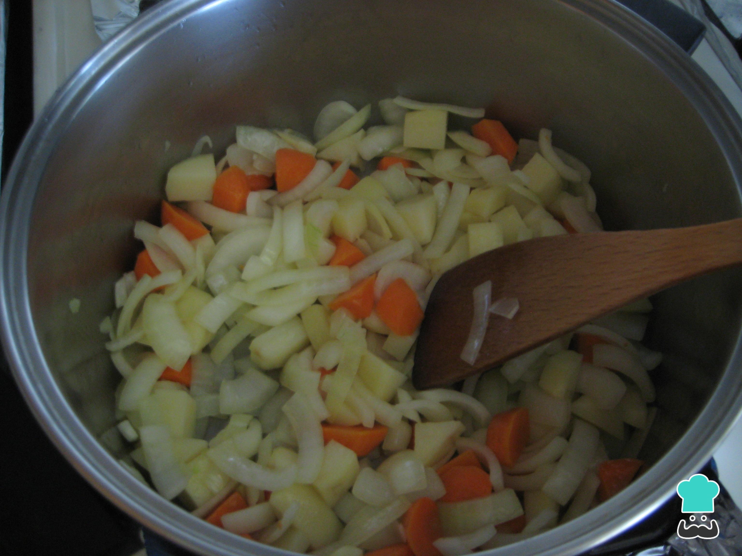 Em seguida descasque a cenoura, a batata e o inhame e pique em cubos. Corte em tiras o pimentão e a cebola. Coloque tudo numa panela, junte a costelinha, cubra de água e deixe cozinhar.