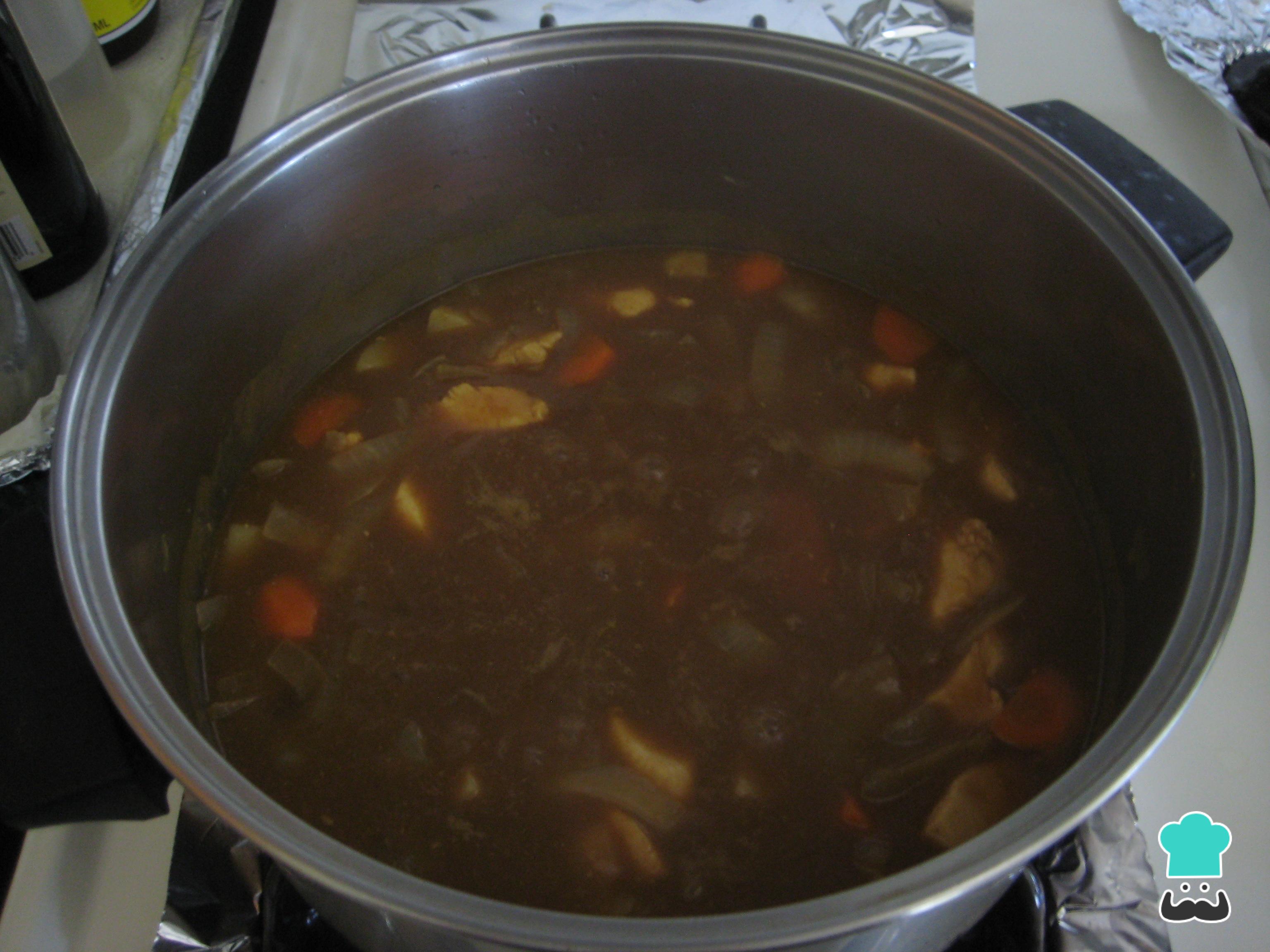 Quando os legumes estiverem cozidos acrescente os temperos: o shoyu, o molho inglês e o curry em tablete. Fique cozinhando por mais 10 minutos, para espessar e apurar o sabor.