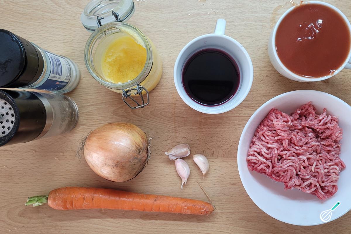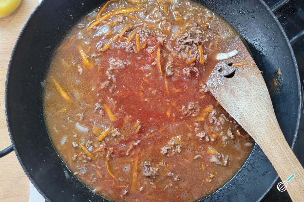 Antes de cozinhar a massa, separe os ingredientes para fazer o molho bolonhesa, que precisa de certo tempo para apurar o sabor. Gosto de refogar os vegetais e a carne com manteiga ghee para trazer um sabor mais acentuado, mas você pode usar manteiga ou substituir por azeite. A cenoura, além de deixar o molho mais nutritivo com mais vegetais, também ajuda a reduzir a acidez do molho de tomate.