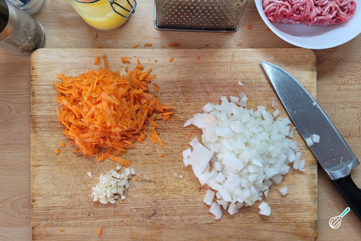 Corte a cebola e o alho em cubinhos e rale a cenoura. Você também pode cortar a cenoura em cubinhos bem pequenos, se preferir.