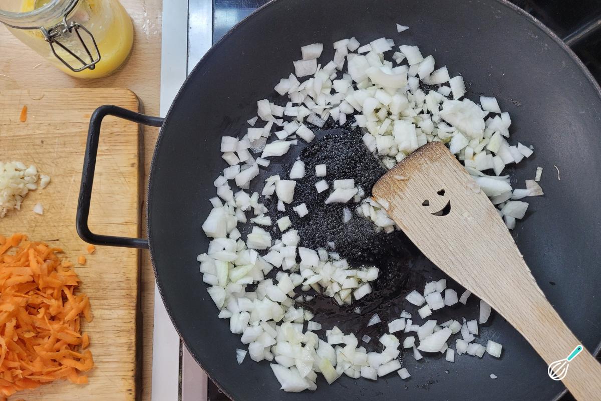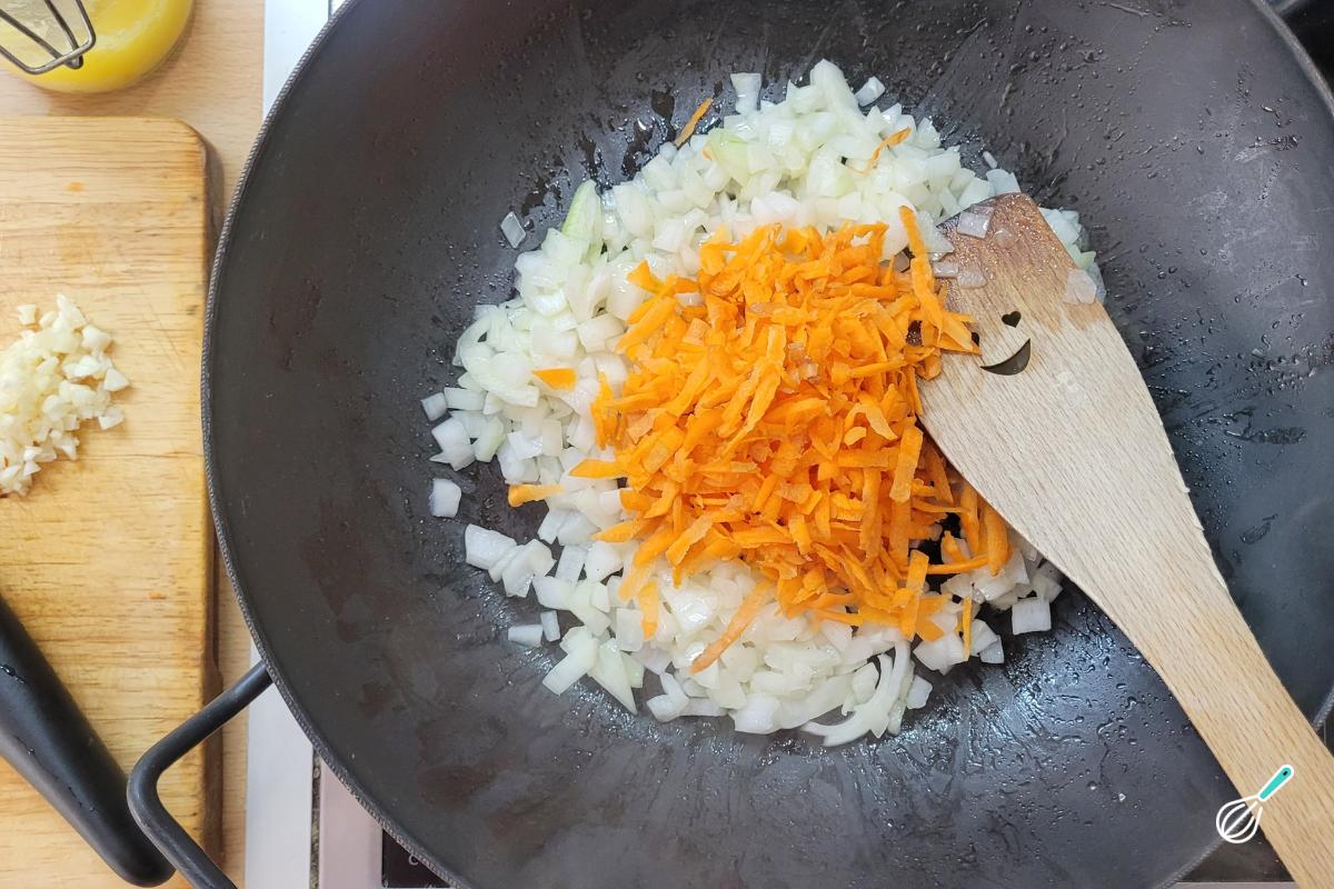 Quando estiver dourada, adicione a cenoura e deixe refogar por mais alguns minutinhos até murchar. Depois, adicione o alho e deixe apenas até começar a perfumar.
