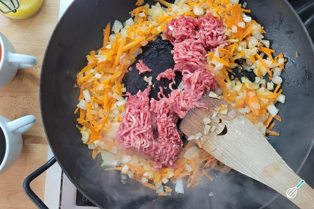 Adicione a carne moída, e vá quebrando em pedaços menores. Adicione sal e pimenta do reino e deixe dourar bem.