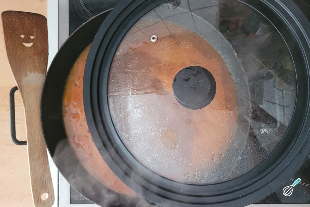 Abaixe o fogo e deixe cozinhar semi-tampado em fogo baixo por cerca de 35-40 minutos até o molho reduzir e encorpar.
