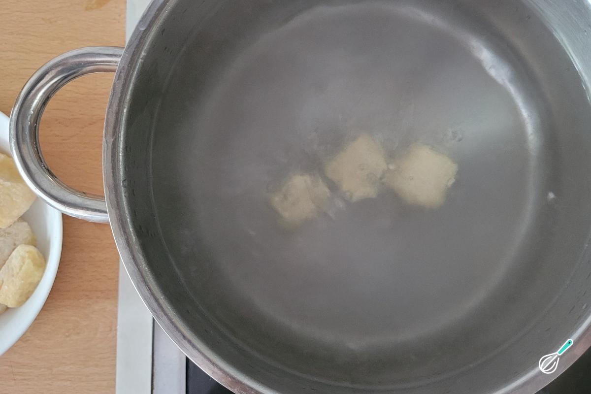 Quando a água estiver fervendo vigorosamente, adicione bastante sal e coloque os nhoques. Pode ir colocando aos poucos para evitar que grudem.