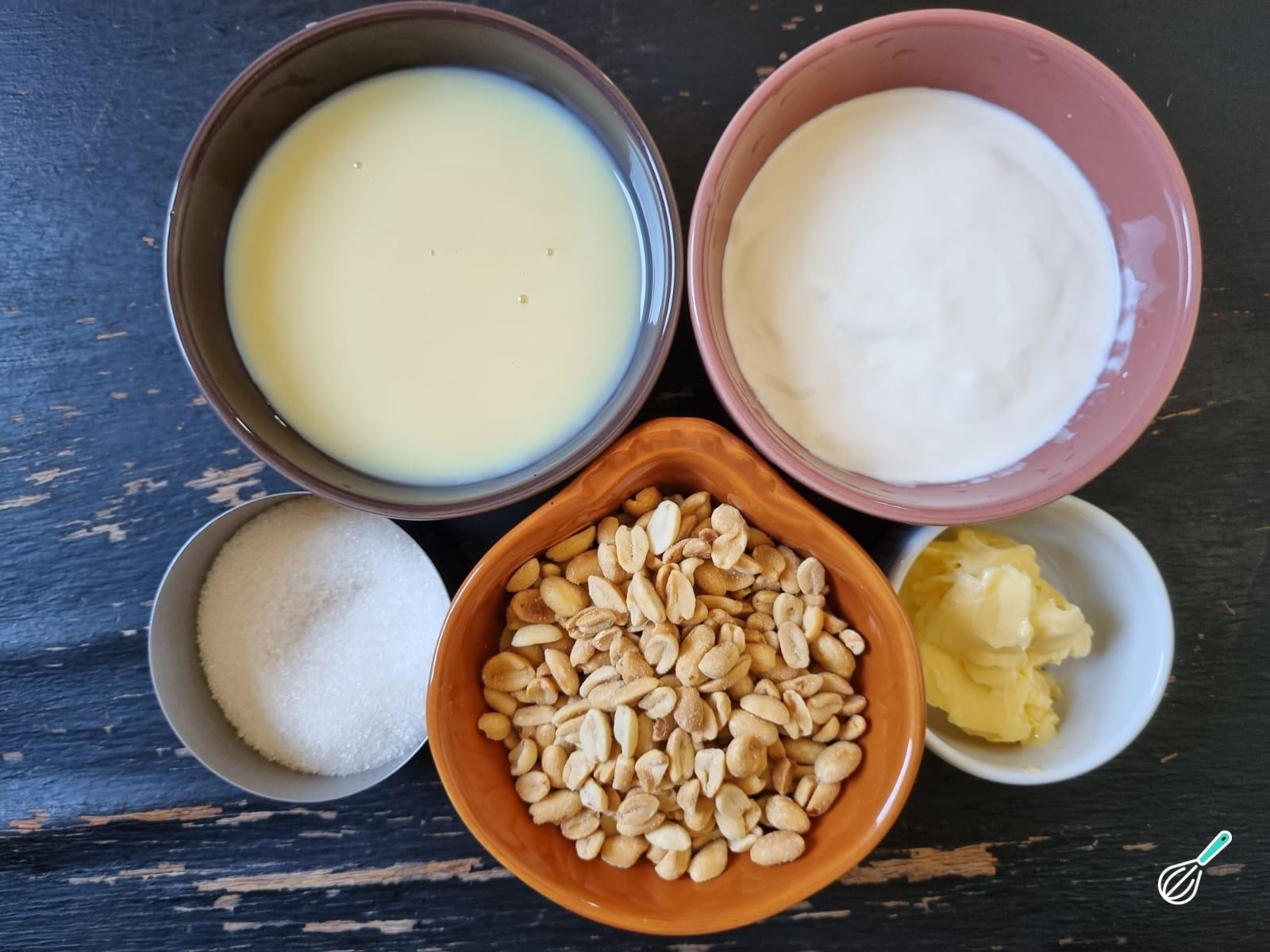 Comece separando todos os ingredientes nas quantidades exatas que vai usar para esse recheio crocante de amendoim.
