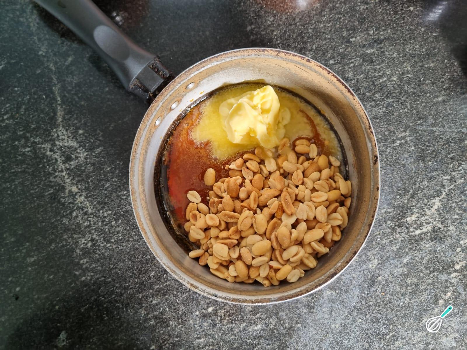 Sem tirar do fogo e com muito cuidado, coloque a manteiga em temperatura ambiente e o amendoim e misture bem até derreter a manteiga e o caramelo envolver todo o amendoim.