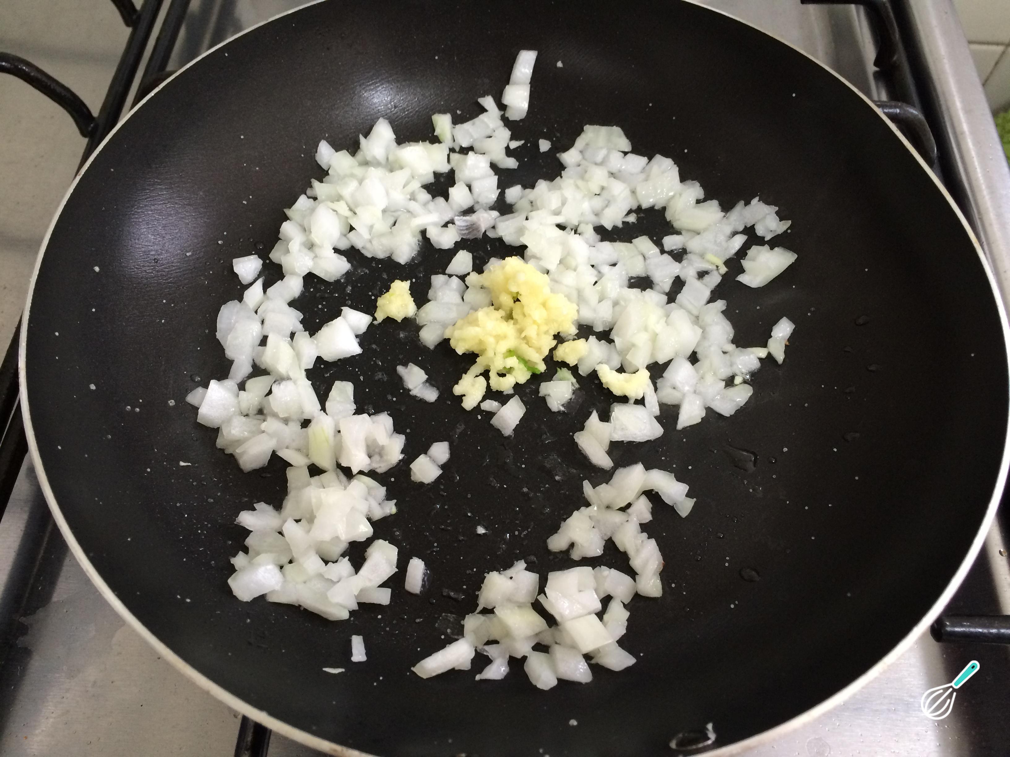 Em uma panela com o óleo, refogue a cebola e o alho finamente picados, e até dourar.