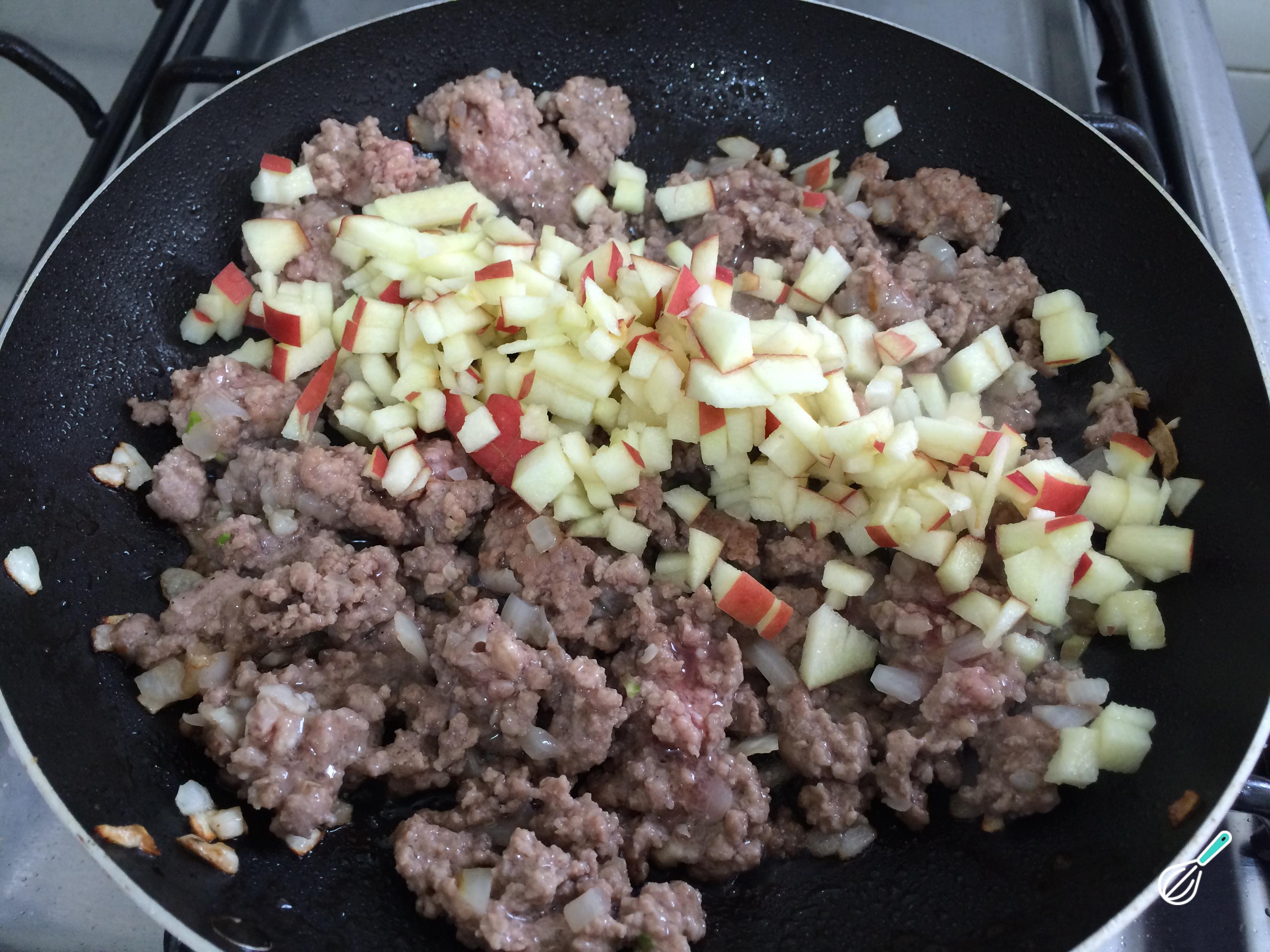Depois adicione a maçã picada em pequenos cubos. Cozinhe em fogo baixo por 10 minutos.