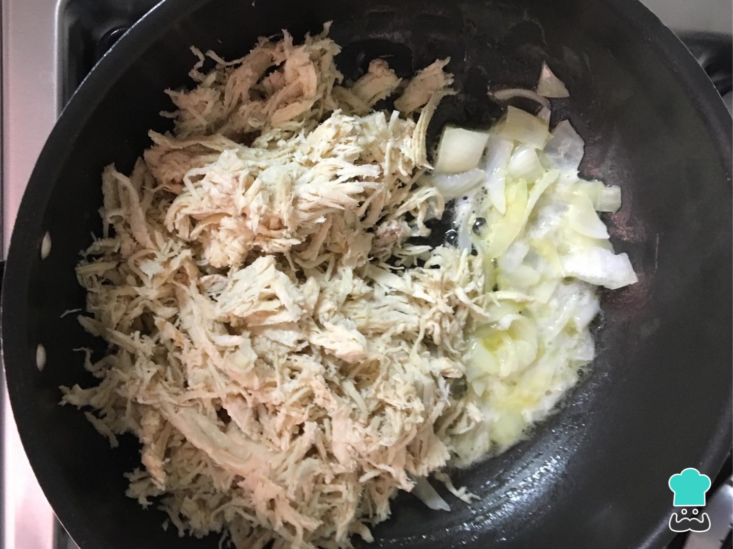 Continue preparando esta receita de recheio de frango fácil: pegue uma panela, refogue a cebola na manteiga e depois junte o frango cozido e desfiado.