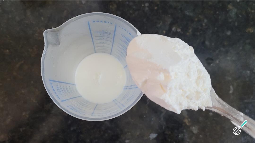 Vamos começar a nossa receita. Em um recipiente, misture 100ml de leite com o amido. Reserve.